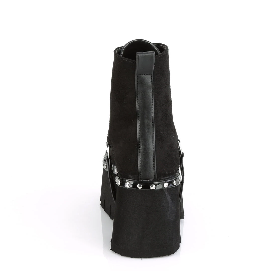 3 1/2″ (90mm) Chunky Heel Cut Out Platform Ankle Boot w/ Metal Front Zip Closure, Silver Stud Embellishments on Upper & Trims Around the Platform Bottom & D-Rings w/ Harness Strap