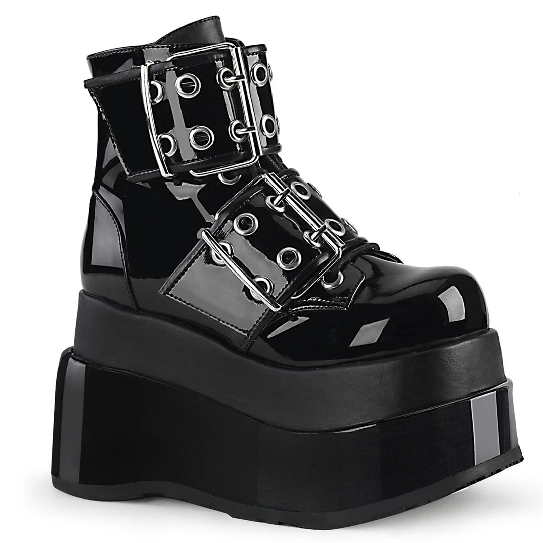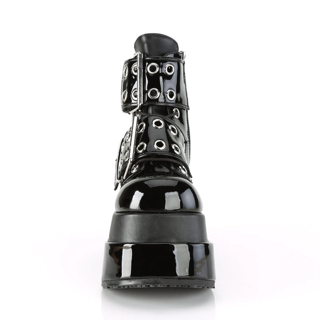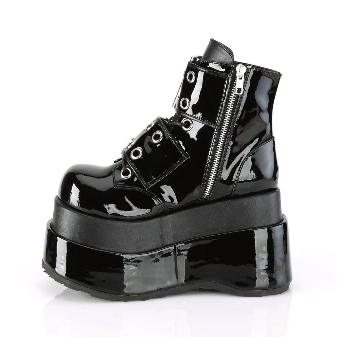 4 1/2″ (114mm) Tiered Platform Lace-Up Front Ankle Boot Featuring Double Grommet Buckle Straps, Inside Zip Closure