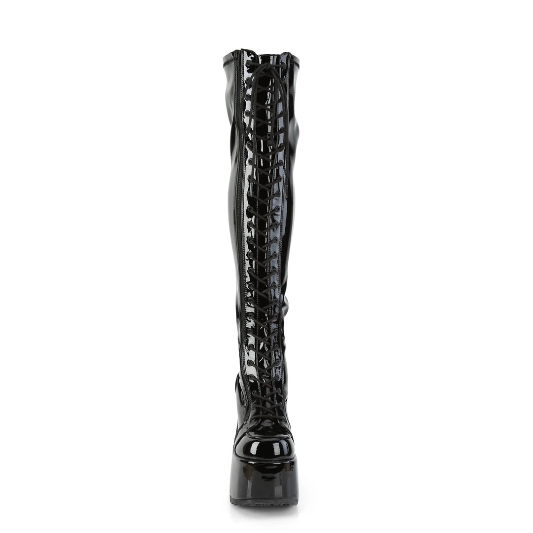 5″ Chunky Heel, 3″ Platform Lace-Up Stretch Thigh-High Boot, Full Length Outside Metal Zipper