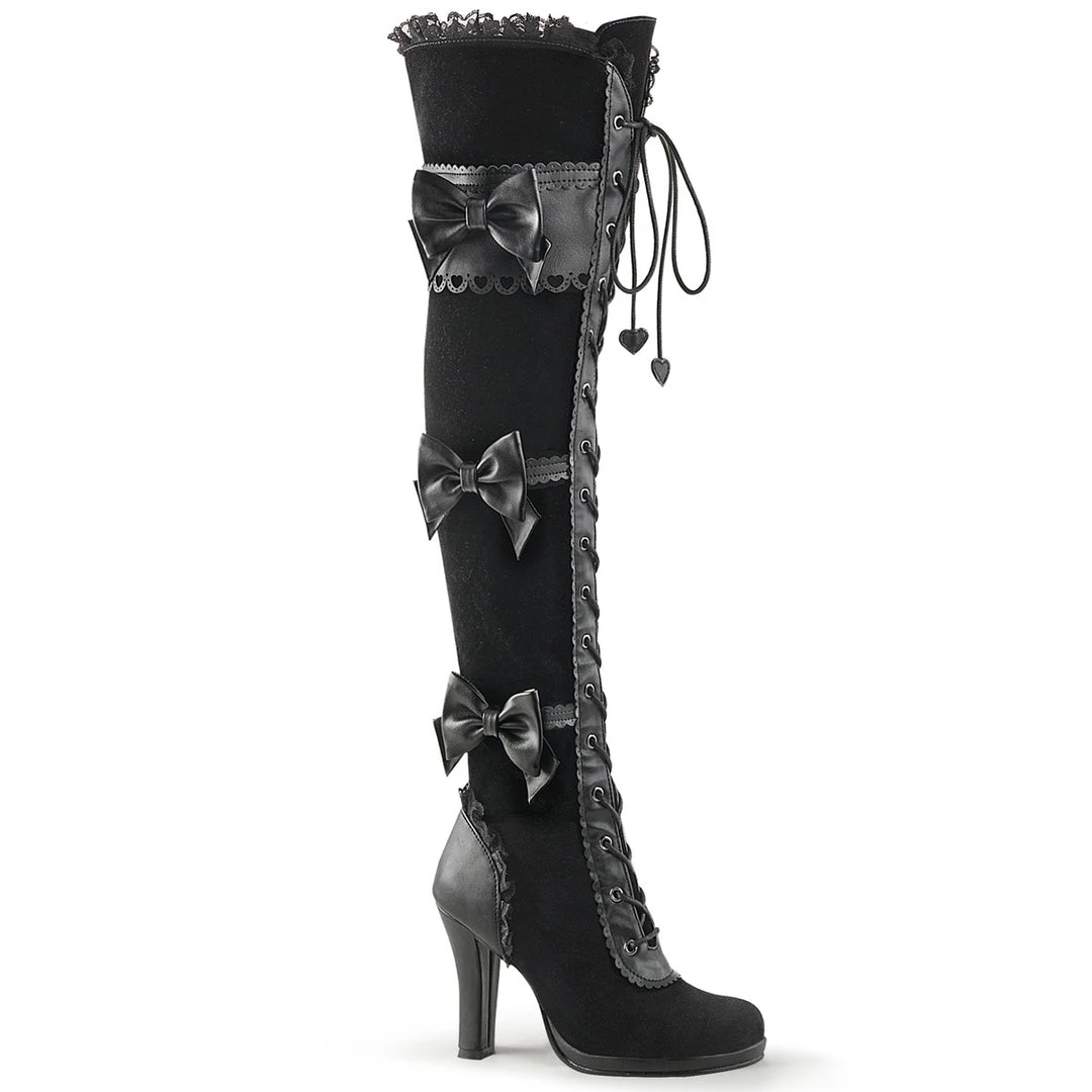 3 3/4″ (9.5cm) Heel, 1/2″ (1.3cm) Platform Goth Lolita Lace-Up Front Over-the-Knee Boot Featuring Straps with Scalloping & Bow Details, 1/3 Inner Side Zipper