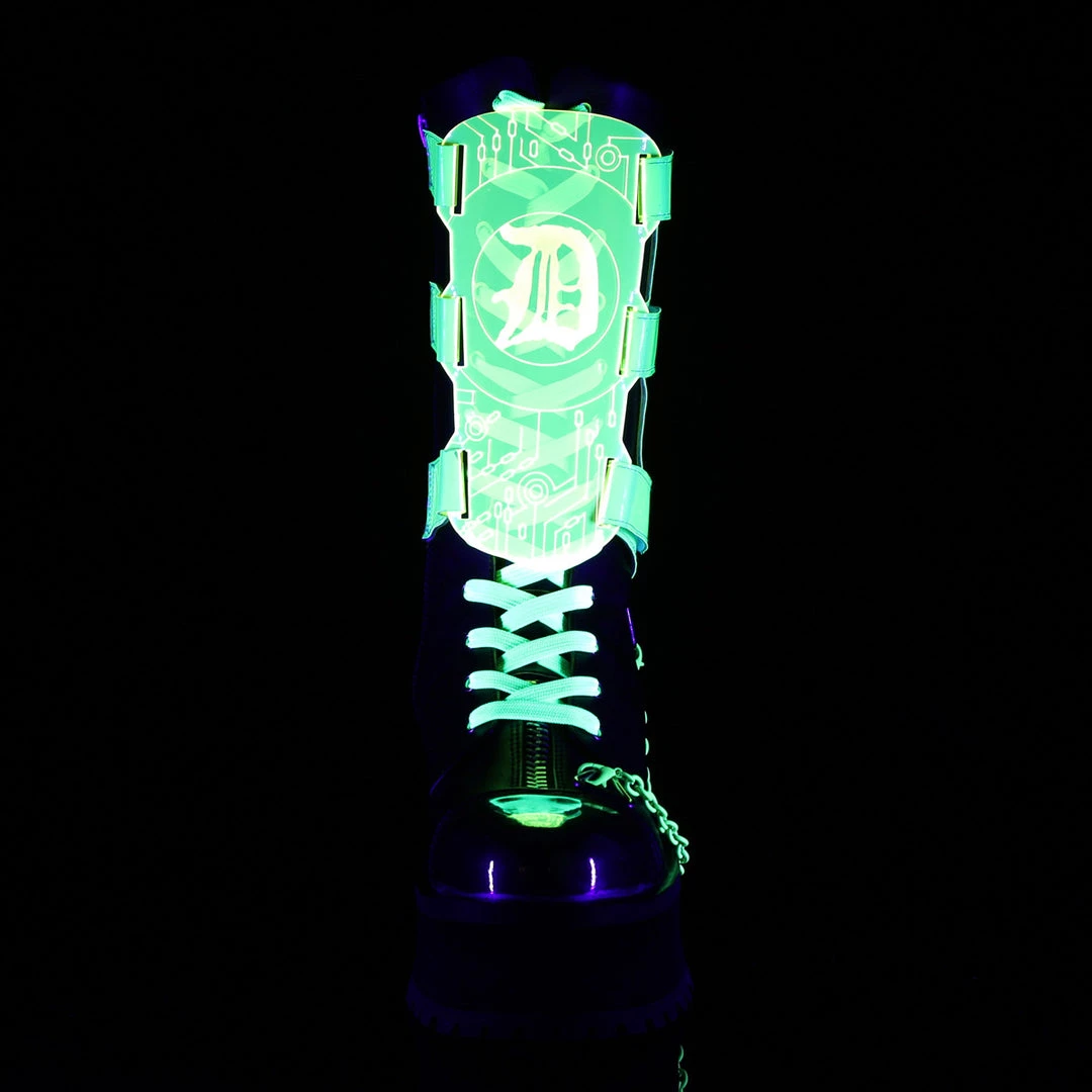 2 3/4″ (70mm) Platform Lace-Up Mid Calf Boot W/ Silver Chrome Plated Metal Toe Cap & UV Blacklight Reactive Acrylic Shield w/ Haness Straps and Pyramind Ring & Chain Details, Full Length Inside Metal
