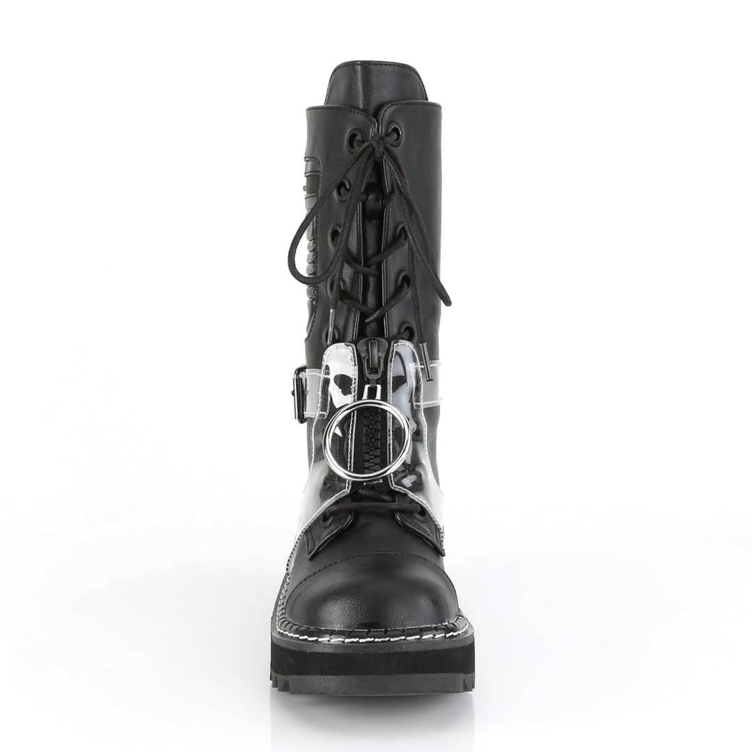 1 1/4″ (32mm) Platform Lace-Up Mid-Calf Boot Featuring Outside Zippered Pocket & Transparent Harness w/ Zippered Front & Oversized O-Ring Zipper Pull, Back Zip Closure