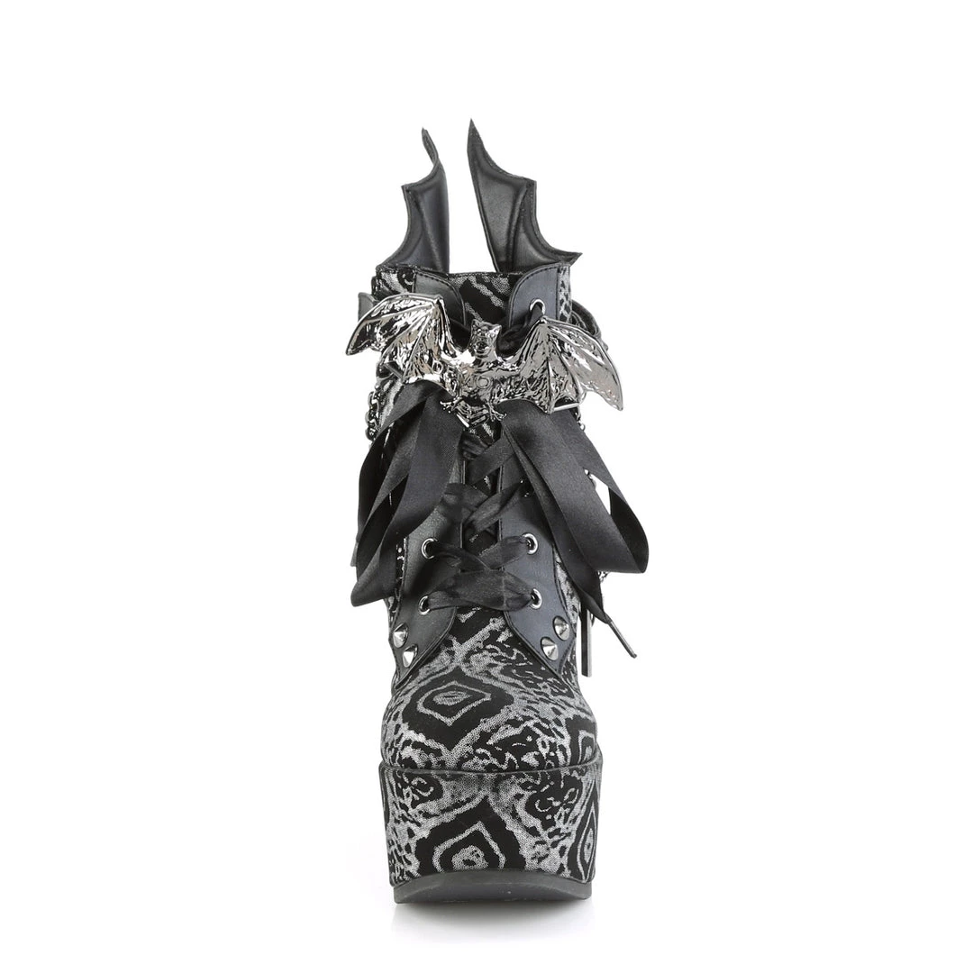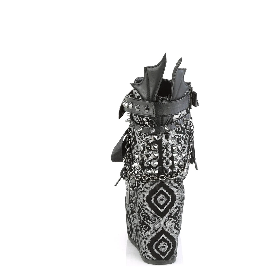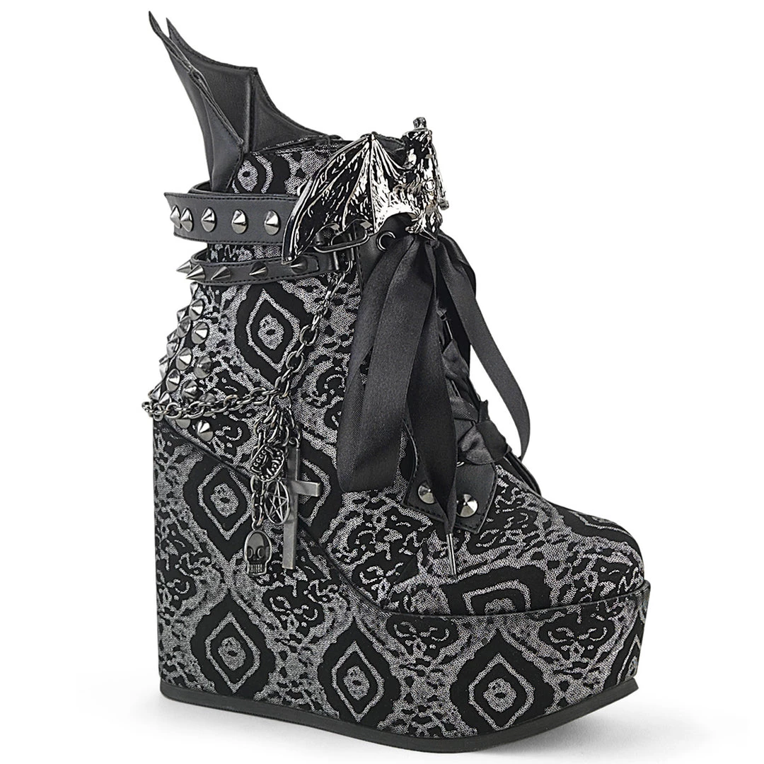 5″ (127mm) Wedge Platform Lace-Up Front Ankle Bootie Featuring Wrap Around Studded & Spike Straps w/ Bat Buckle Detail, Chain with Various Hanging Charms, & Batwing Detail Up the Back, Inside Metal Zi