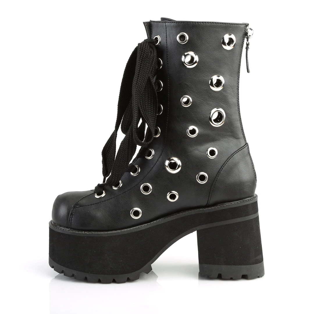 3 3/4″ (95mm) Heel, 2 1/4″ (57mm) Platform Lace-Up Front Ankle Boot Featuring Multi-Size Eyelets on Upper, and 1″ Wide Shoe Lace, Back Zip Closure w/ Skull Zipper Head