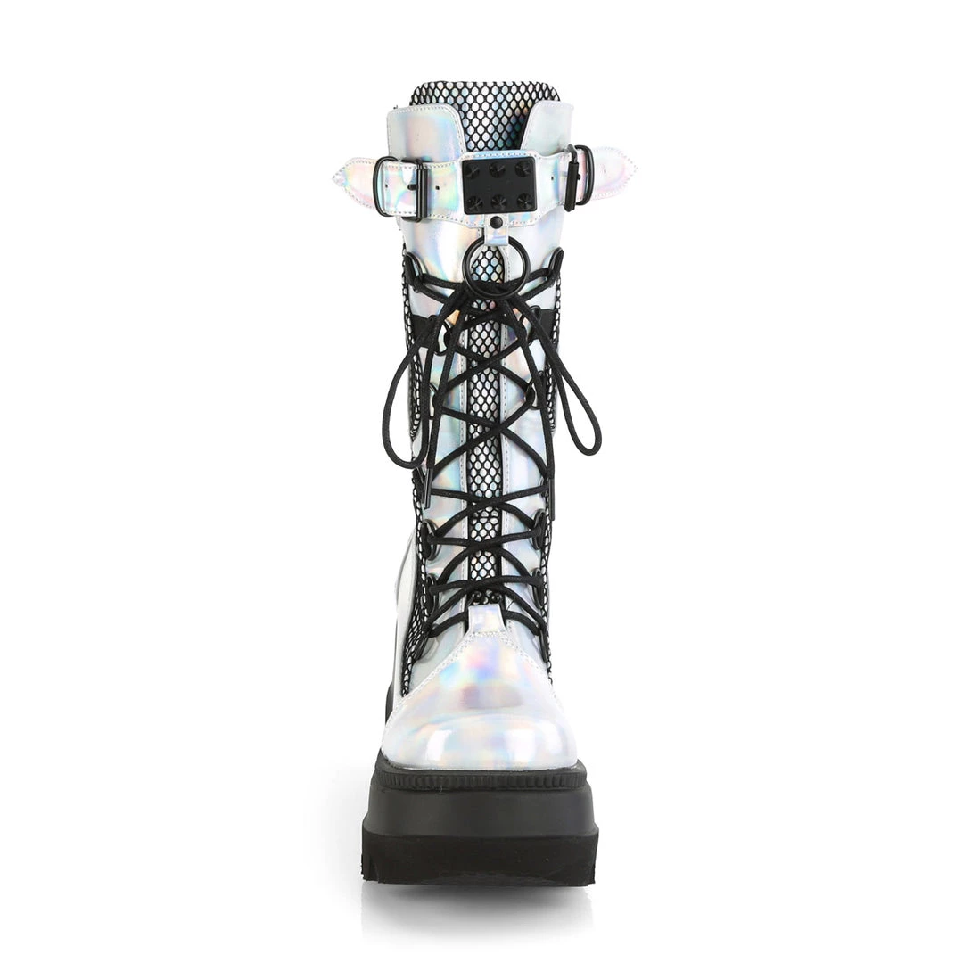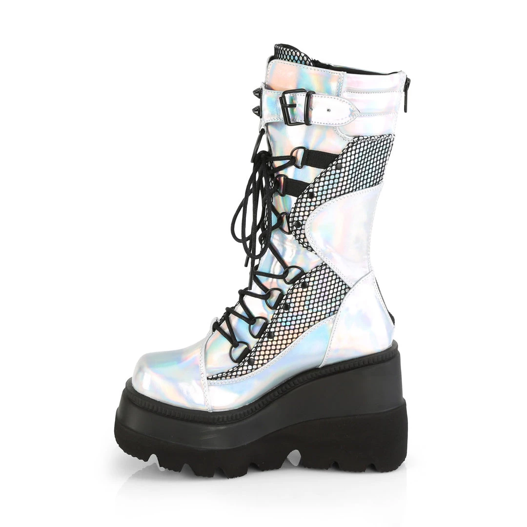 4 1/2″ (114mm) Wedge Platform Lace-Up Mid-Calf Boot W/ Curvy Contrast Panel Designs on Vamp, Featuring Horseshoe Ring Ornament and Buckle Strap W/ Spike Studded Metal Plate and A Large O-Ring, Metal
