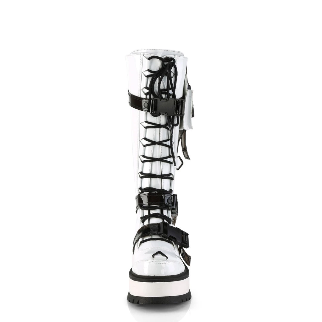 2″ (51mm) Platform Lace-Up Front Knee High Boot Featuring Cargo Side Pocket, Quick Release Plastic Buckle Straps and Studding & Triangle Ring Details, Full Back Metal Zip Closure
