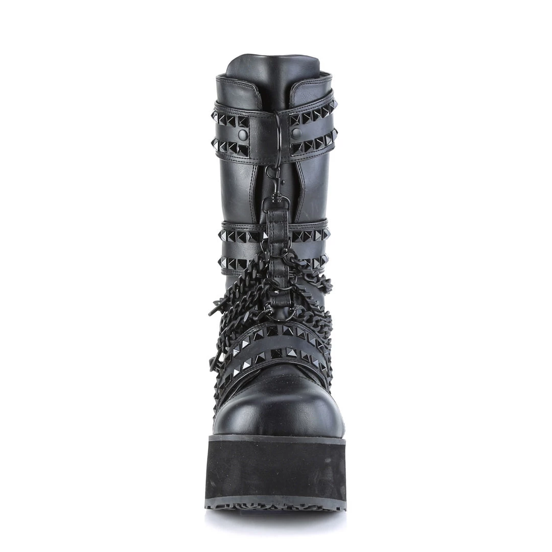 3 1/4″ (83mm) Platform Pyramid Studded Triple Hook and Loop Strap Mid-Calf Boot Featuring Oversize D-Ring on the Top Strap W/ Swivel Hook Cascading Chain Detail, Back Metal Zip Closure