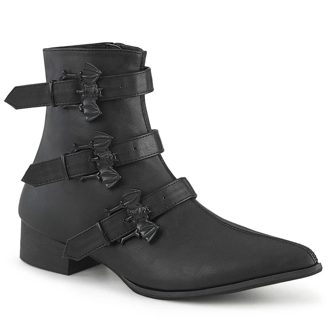 1 1/2″ (38mm) Block Heel Pointed Toe Winklepicker Style Ankle Boot, Featuring Triple Bat Buckle Straps, Inside Zip Closure