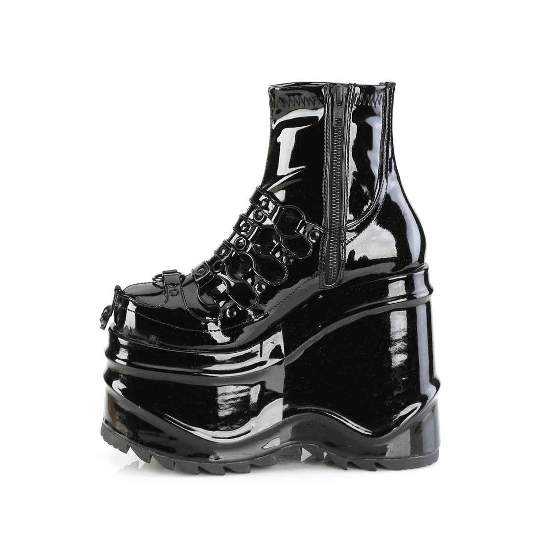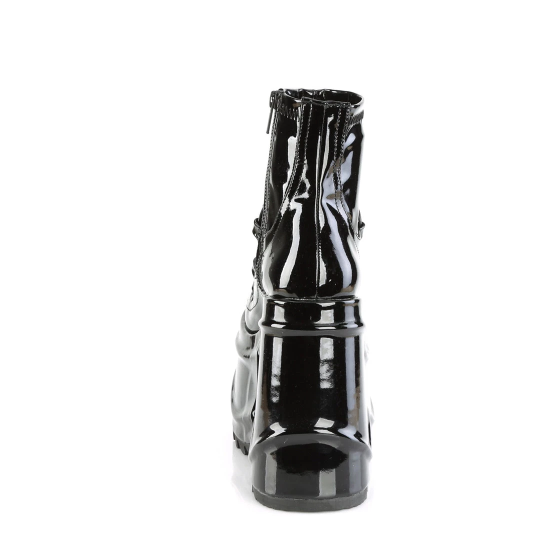 6″ (152mm) Wedge Platform Stretch Ankle Boot Featuring O-Rings, Spike Studs Eyelets & Studded Strappy Details on Vamp W/ Hanging Skull Detail on Toe, Inside Metal Zip Closure,Straps, Back Metal Zip Cl