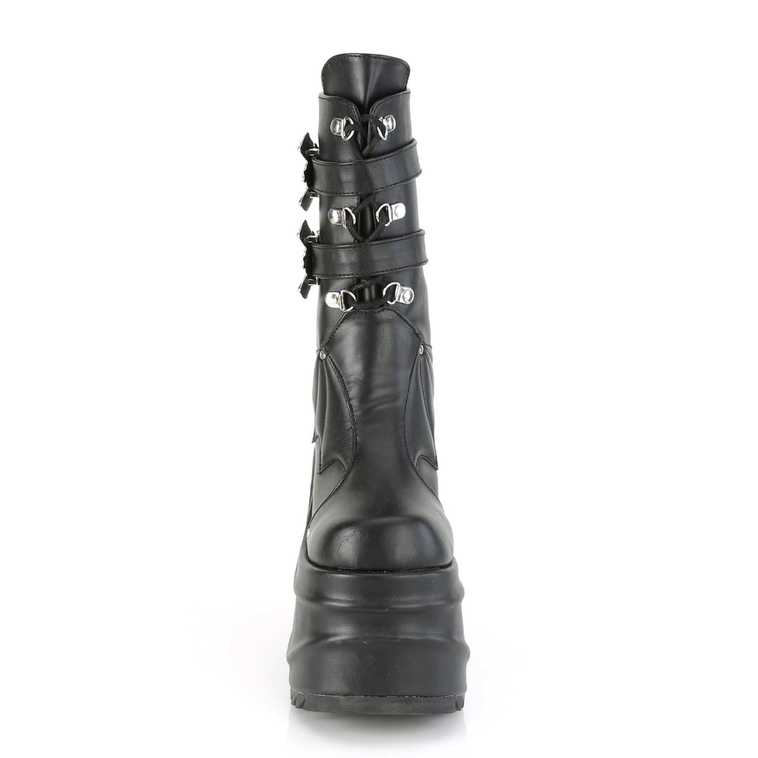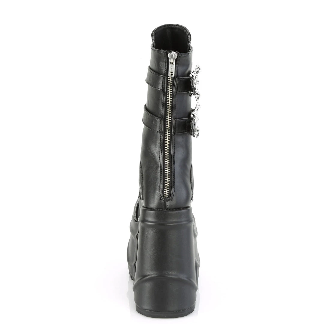 6″ (152mm) Wedge Platform Lace-Up Mid-Calf Boot featuring Quilted Bat Wings Design on Vamp & 2 Bat Buckle Ankle Straps, Back Metal Zip Closure