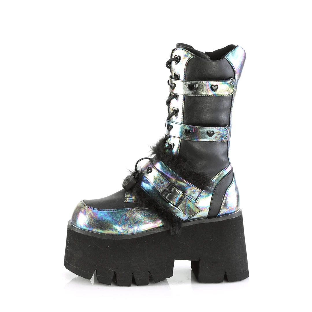 3 1/2″ (90mm) Chunky Heel, 2 1/4″ (57mm) Cut-Out Platform Heart Eyelet Lace-Up Mid-Calf Boot Featuring Triple Hook & Loop Straps w/ Heart Stud Detals & Fur Lined Adjustable Bottom Strap W/ Heart Locke