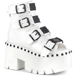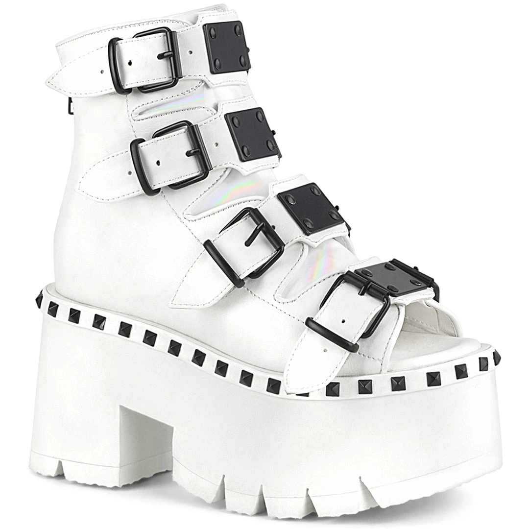 3 1/2″ (90mm) Chunky Heel Metal Studded Trim Accented 2 1/4″ (57mm) Cut Out Platform Bootie Sandal Featuring 4 Buckle Straps w/ All Hardware In Black Matte, Metal Plates at Center, Back Metal Zip Clos