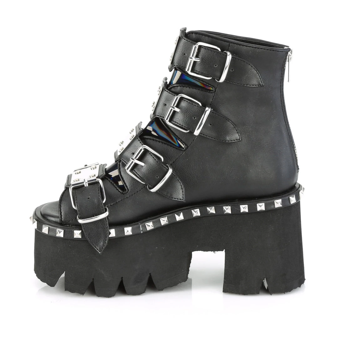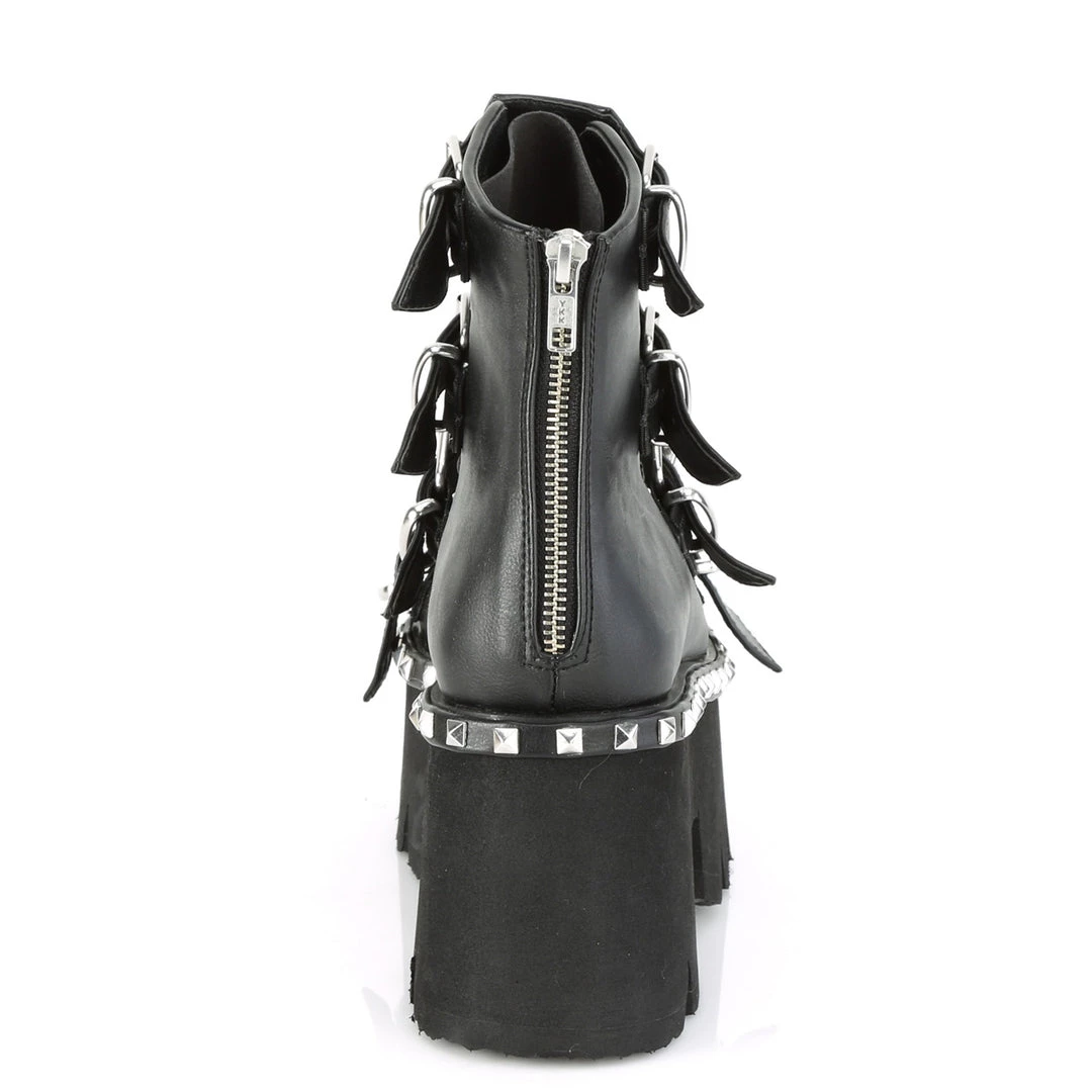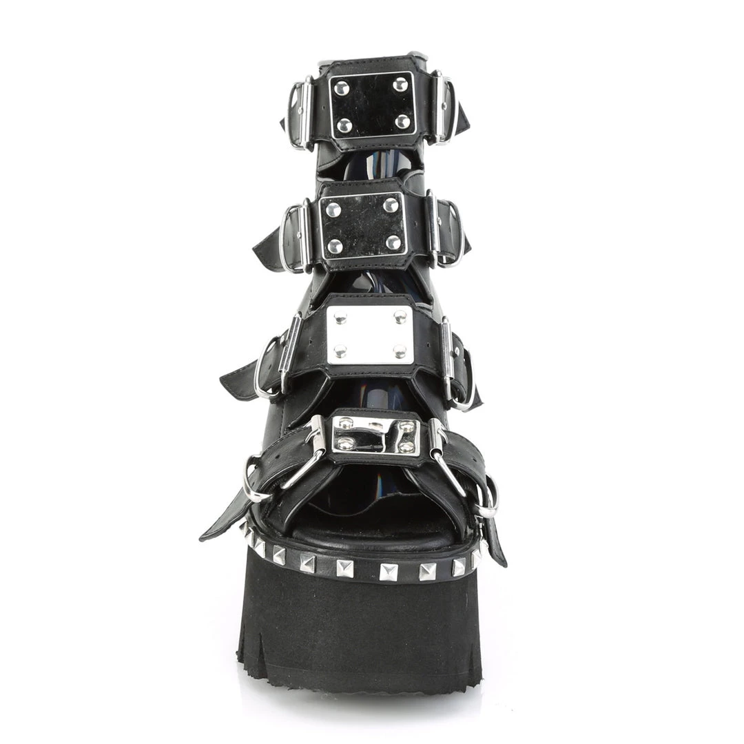 3 1/2″ (90mm) Chunky Heel 2 1/4″ (57mm) Cut Out Metal Studded Trim Accented Platform Bootie Sandal Featuring 4 Buckle Straps w/ Silver Chrome Plated Metal Plates at Center, Back Metal Zip Closure