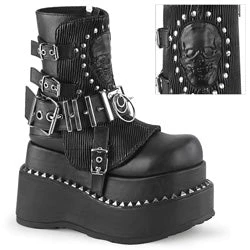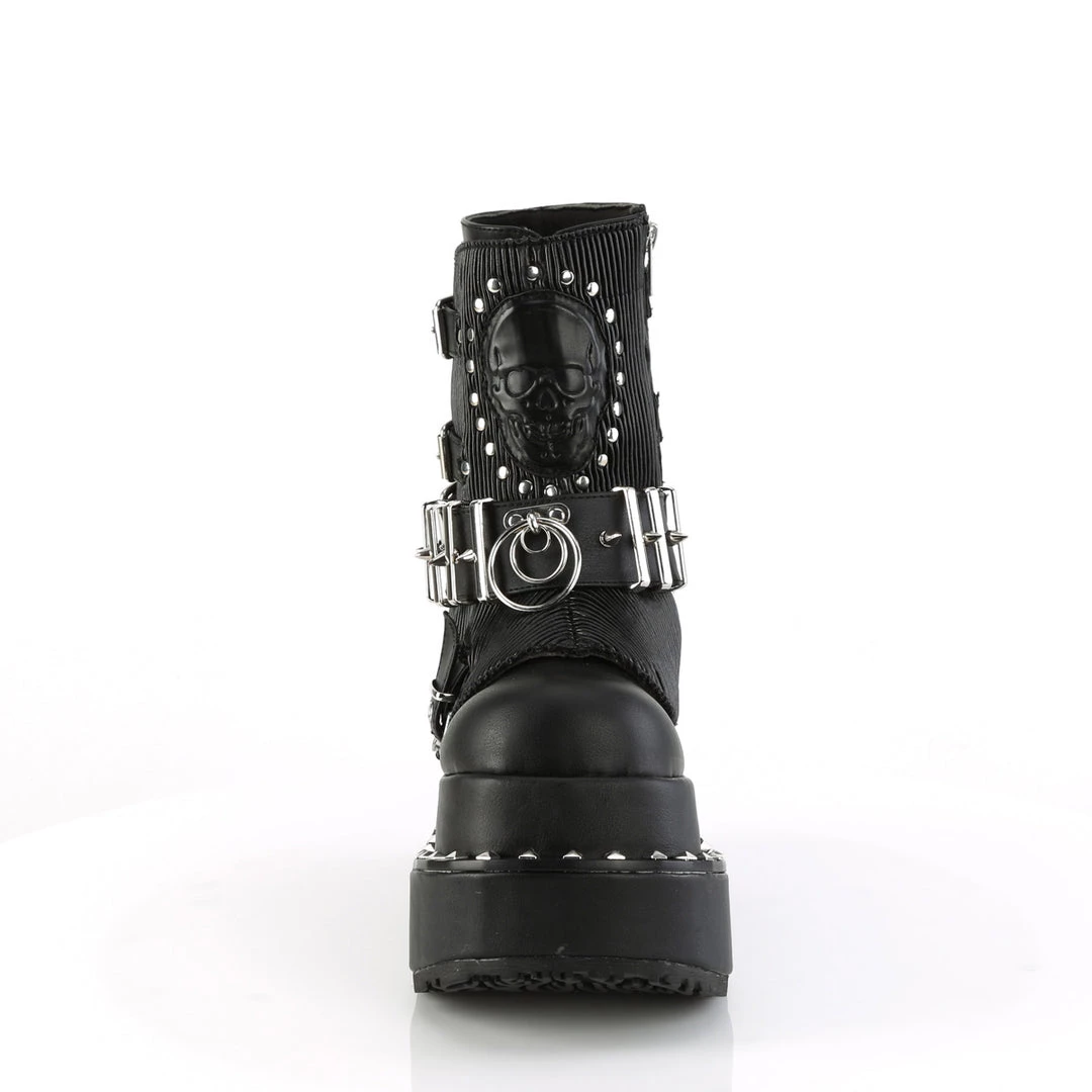 4 1/2″ (114mm) Tiered Pyramid Stud Trimmed Platform Lace-Up Ankle Boot Featuring Adjustable Quilted Shield w/ Stud & Skull Patch Details & Spike Stud, Metal Bar & O-ring Center Strap, Side Zip Closur