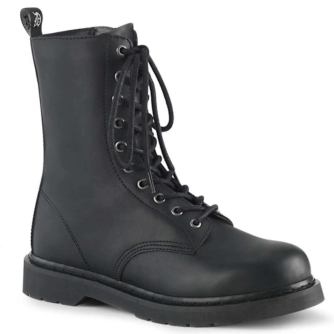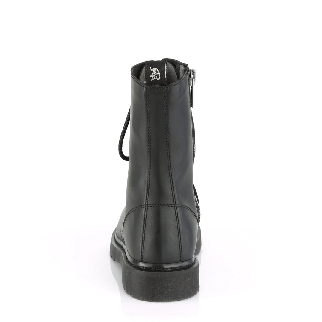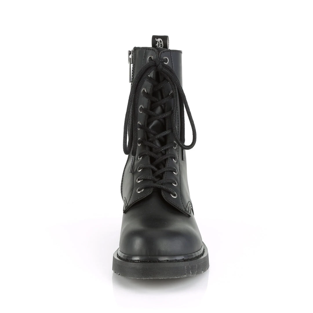 1 1/4″ (32mm) Stacked Flat Heel 10-Eyelet Lace-Up Mid Calf Unisex Vegan Boot w/ Back Pull-Tab, Inside Zip Closure