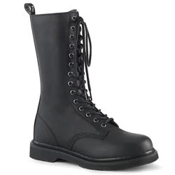 1 1/4″ (32mm) Stacked Flat Heel 14-Eyelet Lace-Up Mid Calf Unisex Vegan Boot w/ Back Pull-Tab, Inside Zip Closure