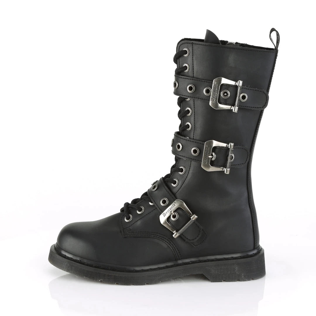 1 1/4″ (32mm) Heel 14 Eyelet Unisex Mid-Calf Combat Boot Featuring Triple Buckle Straps, Inside Zip Closure