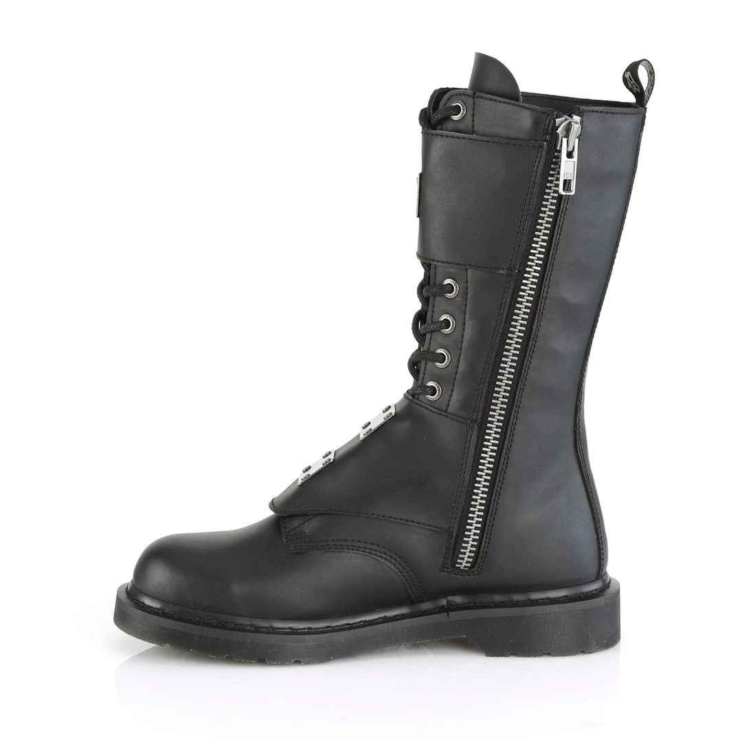 1 1/4″ (32mm) Heel 14 Eyelet Unisex Mid-Calf Combat Boot Featuring Buckled Panels w/ Metal Plate Center, Inside Zip Closure