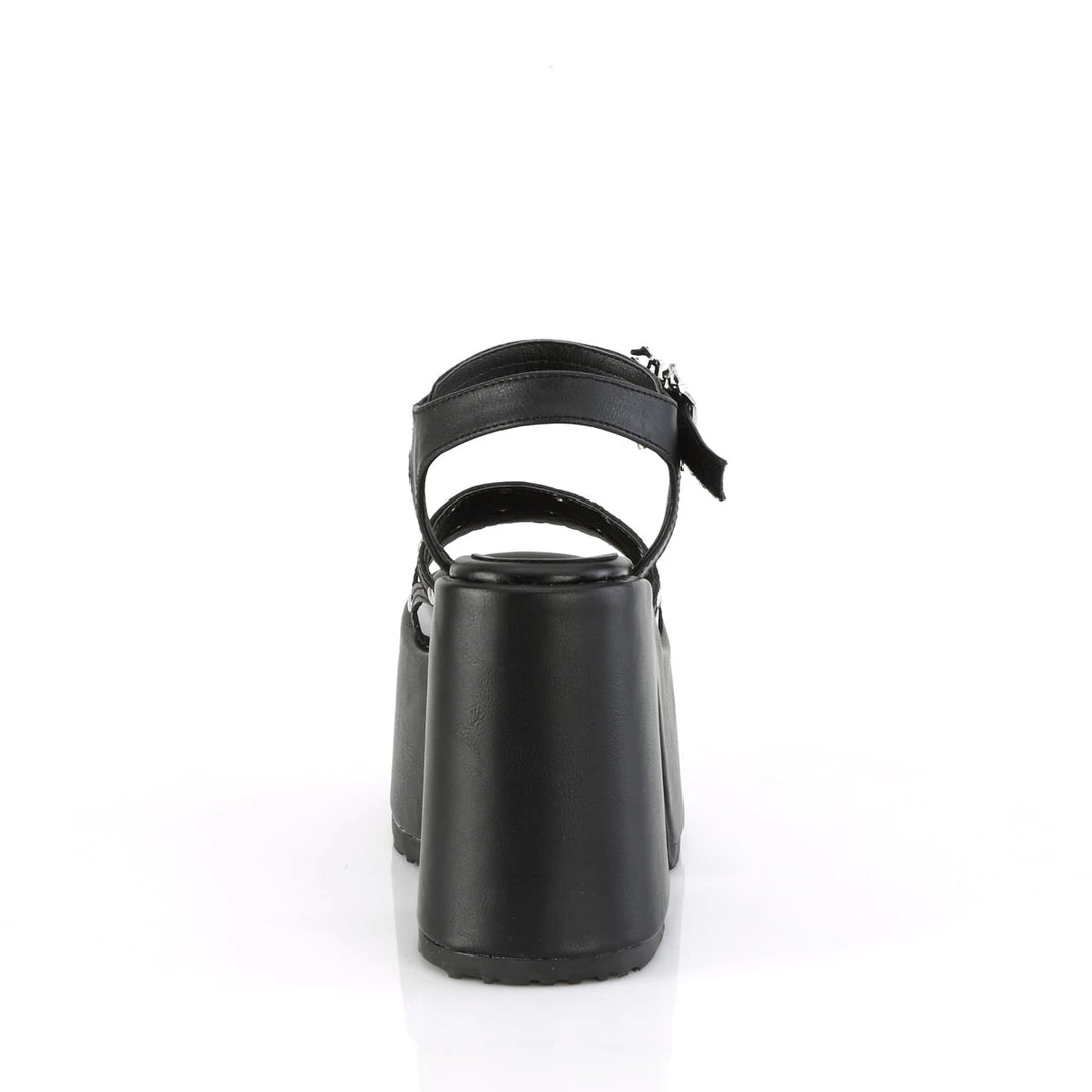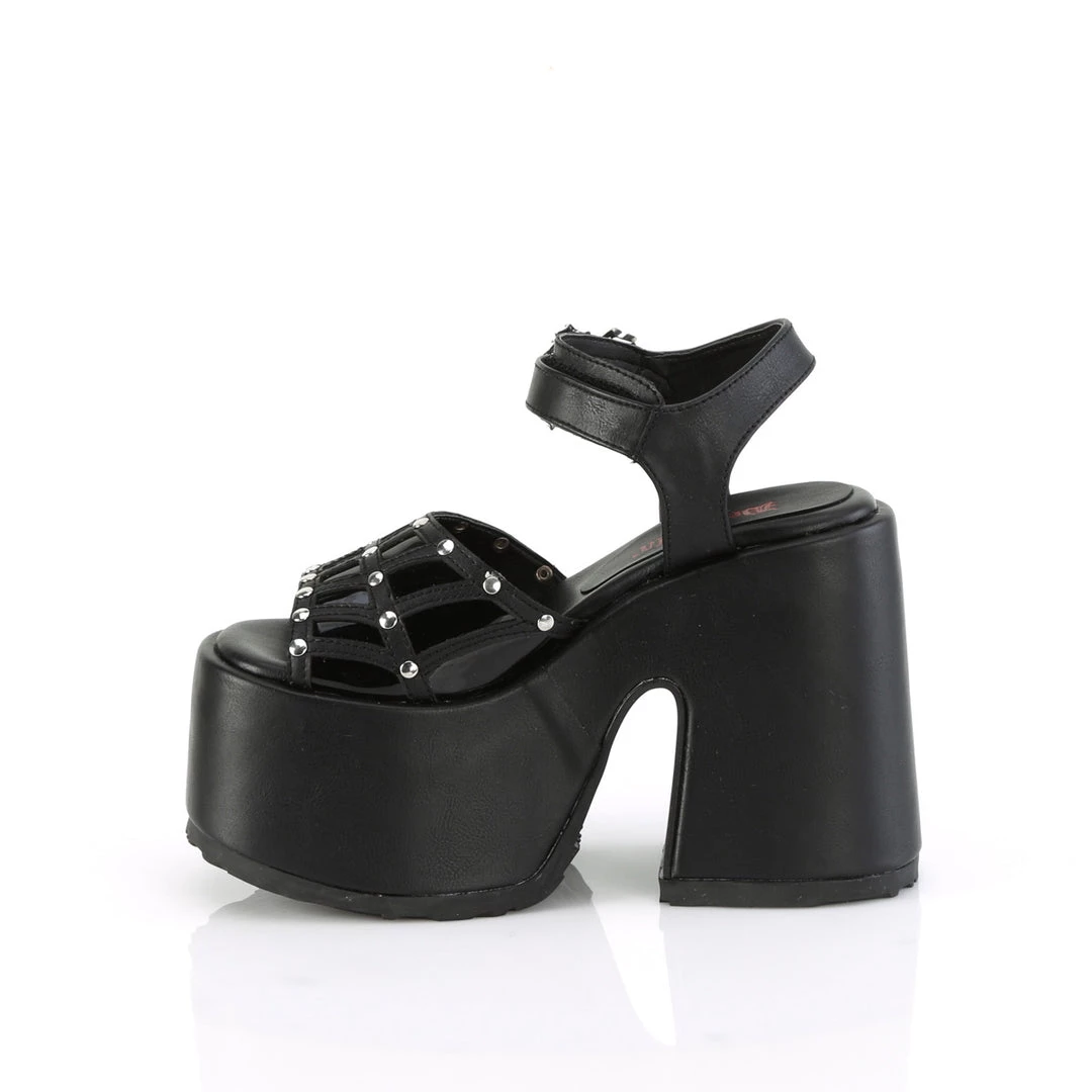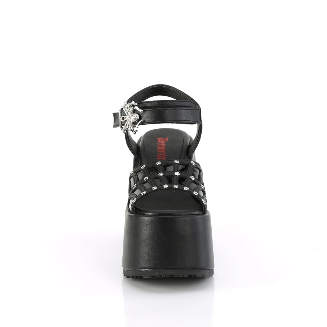 5″ (127mm) Chunky Heel, 3″ (76mm) Platform Ankle Strap Sandal Featuring Silver-Tone Spider Shaped Buckle at Strap, Silver Studs and Spider Web Detail on Vamp