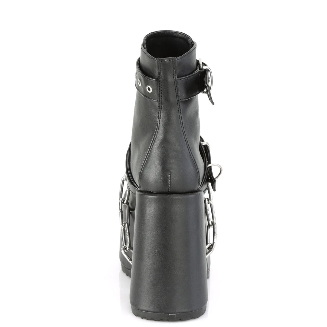 5″ (127mm) Chunky Heel, 3″ (75mm) Platform Ankle Boot w/ Metal Front Zip Closure Featuring Top Buckle Strap w/ Eyeylet & Lower Buckle Strap w/ eyelets, D-Ring & Chrome Metal Plated Padlock w/ Thick M