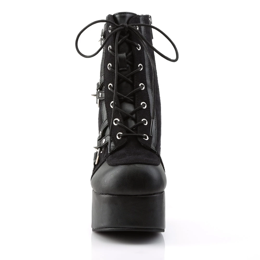 4 1/2″ (114mm) Block Heel, 2″ (51mm) Platform Lace-Up Front Ankle Boot with Spiky Studs on Upper & Heel & O-Ring Detail, Inner Side Zipper