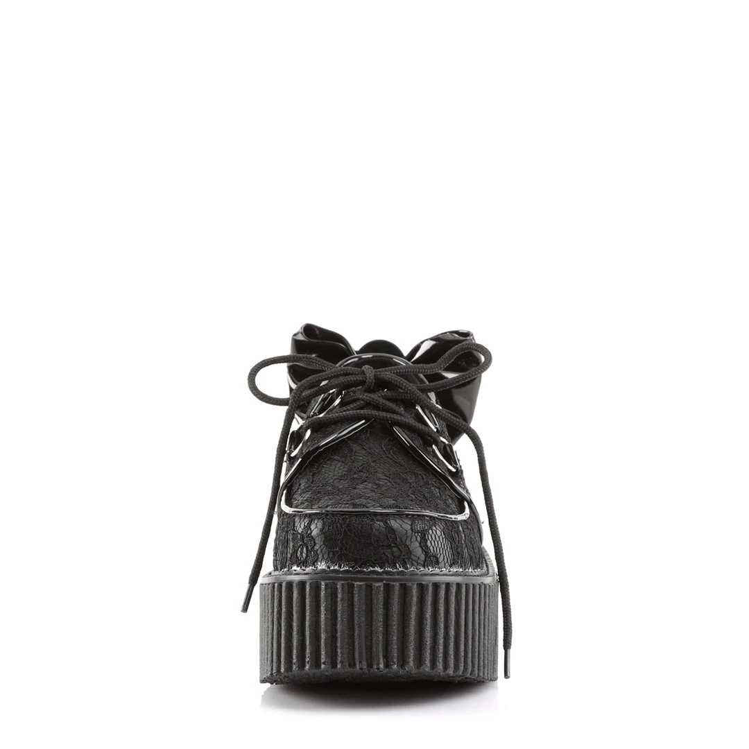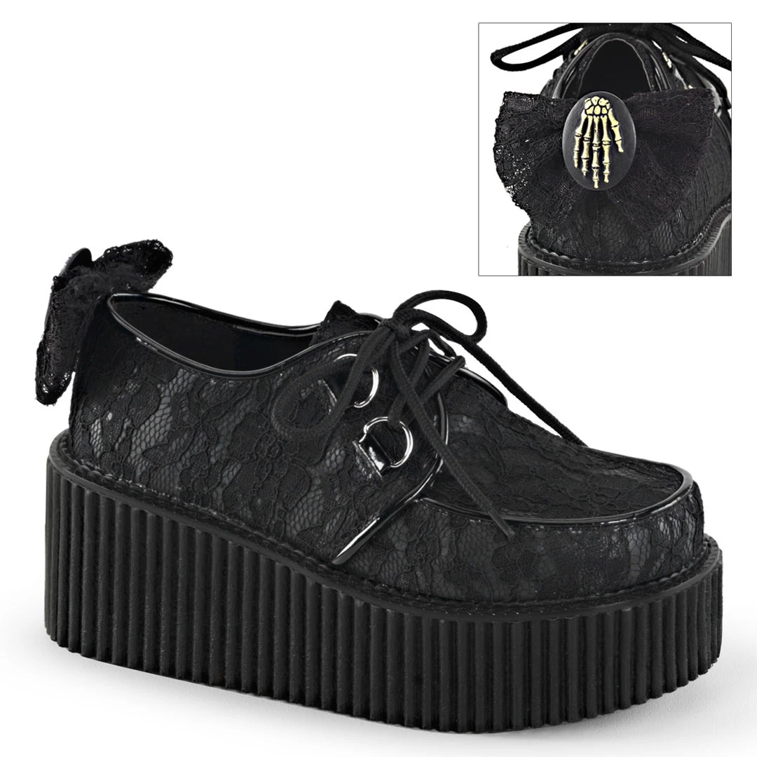 3″ (76mm) Platform Lace-Overlay Creeper Featuring Lace Bow with Skeleton Hand and D-Ring Lace & Piping Detail