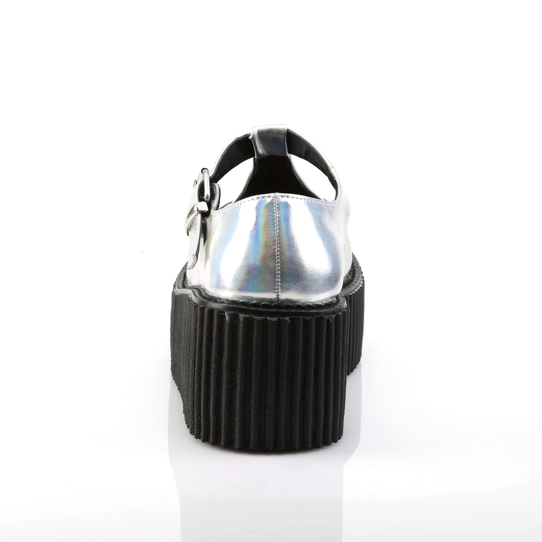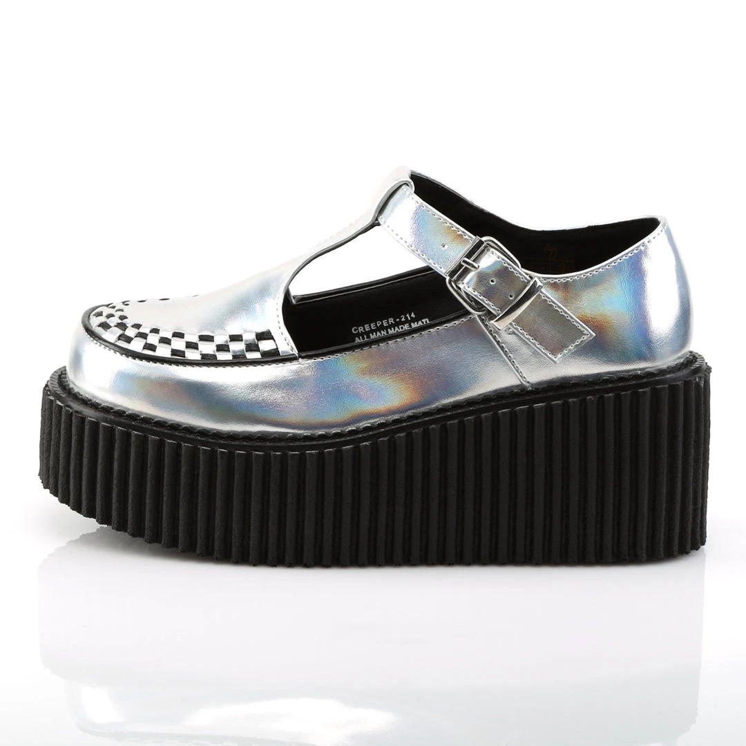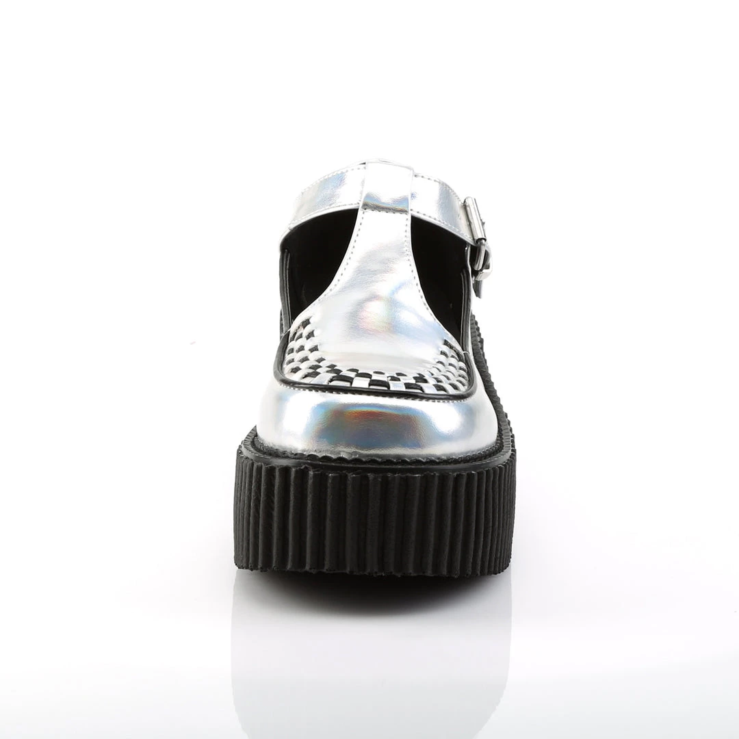 3″ (76mm) Platform T-Strap Creeper Featuring Side Cutout Design and Interwoven Apron & Piping Detail, Buckle Closure