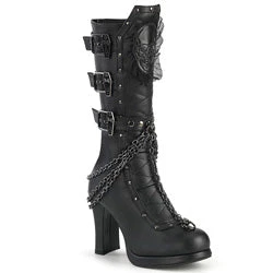 4″ (102mm) Block Heel, 3/4″ (19mm) Platform Mid-Calf Boot W/ Coffin Buckle Straps, Skull Patch & Lace Embelished Quilted Front Panel W/ Studs & Swivel Hook Cascading Chain Detail, Metal Back Zip Closu