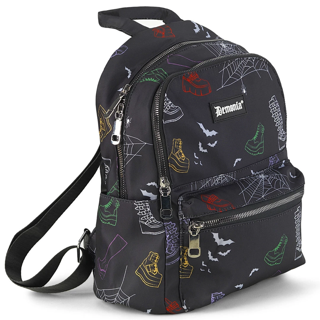 9″ x 10.5″ x 4″ Nylon Mini Backpack With Printed Demonia Design. Featuring a Front Zipper Pocket, Double Top Zipper Closure, Adjustable Straps & Carrying Handle.