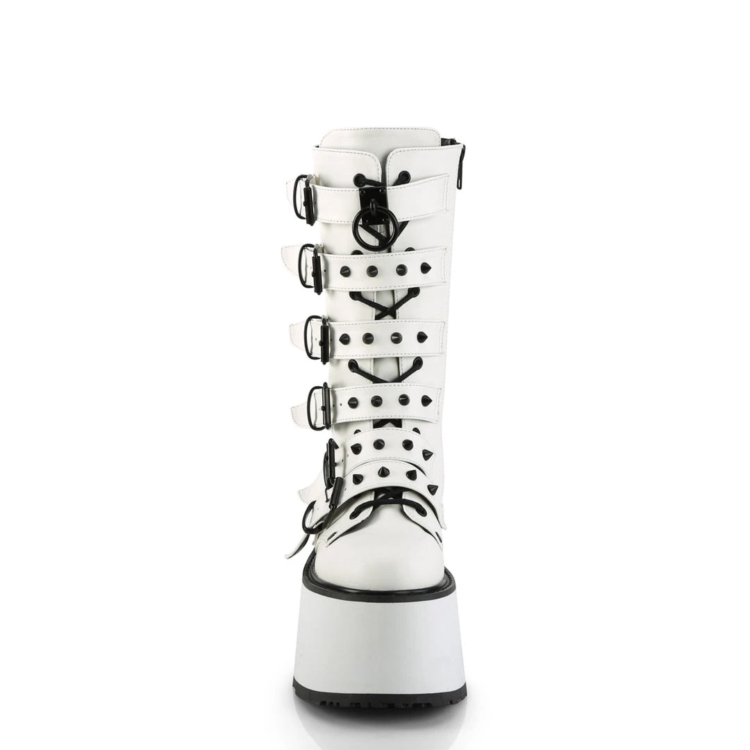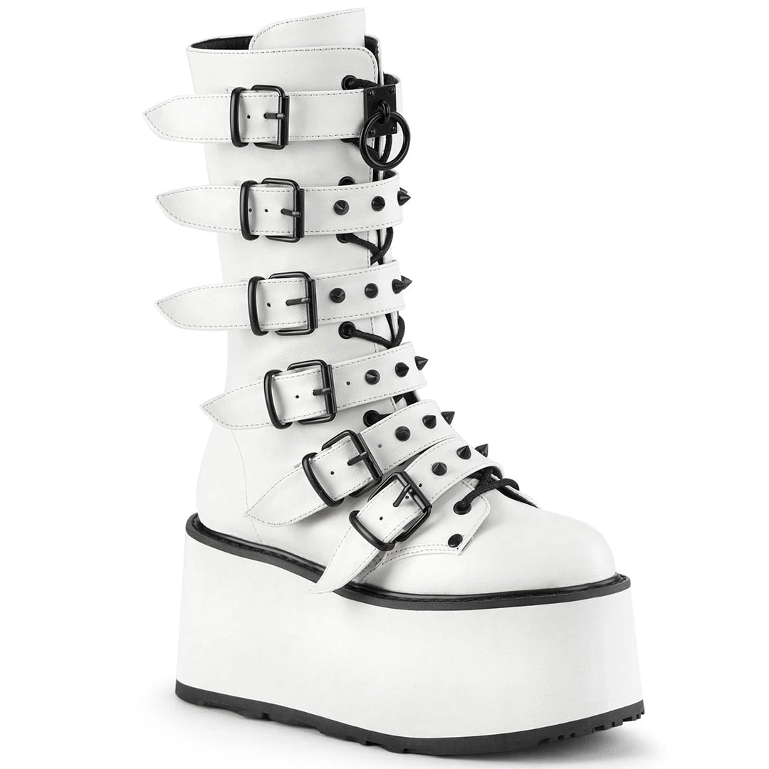 3 1/2″ (90mm) Platform Lace-Up Front Mid-Calf Boot Featuring 6 Cone-Studded Buckle Straps, Inside Metal Zip Closure