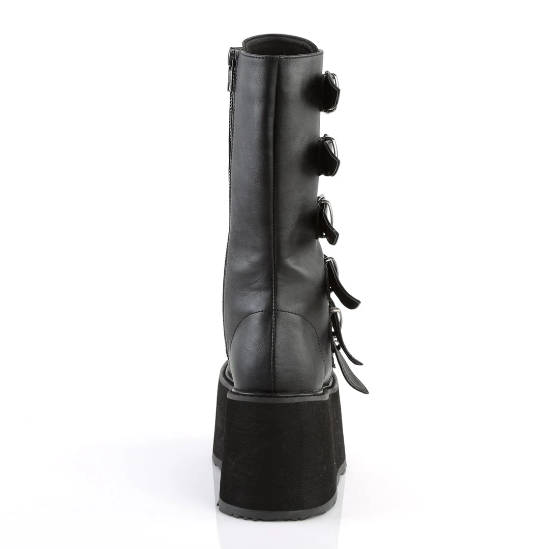 3 1/2″ (90mm) Platform Lace-Up Front Mid-Calf Boot Featuring 6 Cone-Studded Buckle Straps, Inside Metal Zip Closure