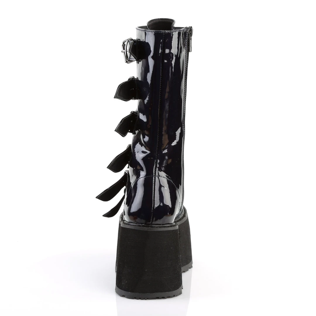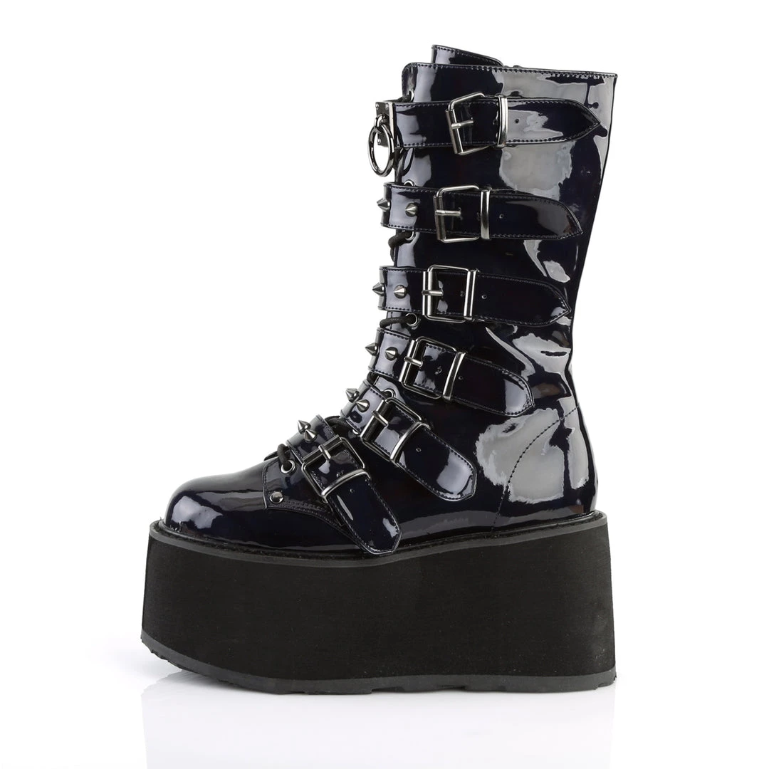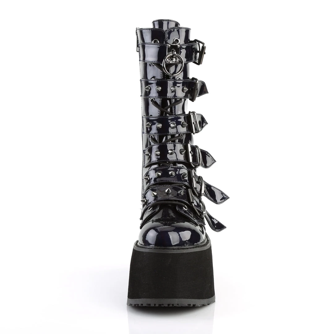 3 1/2″ (90mm) Platform Lace-Up Front Mid-Calf Boot Featuring 6 Cone-Studded Buckle Straps, Inside Metal Zip Closure