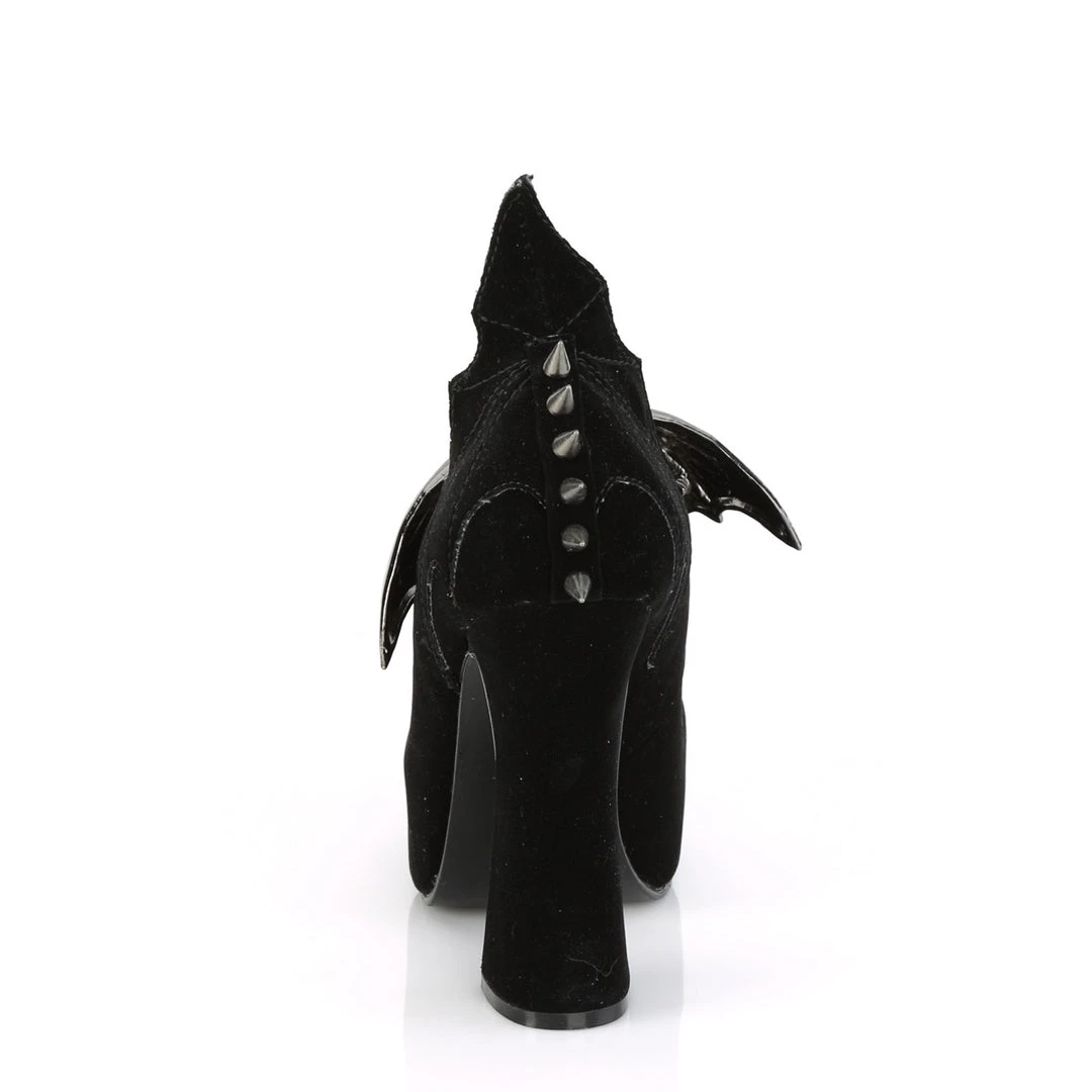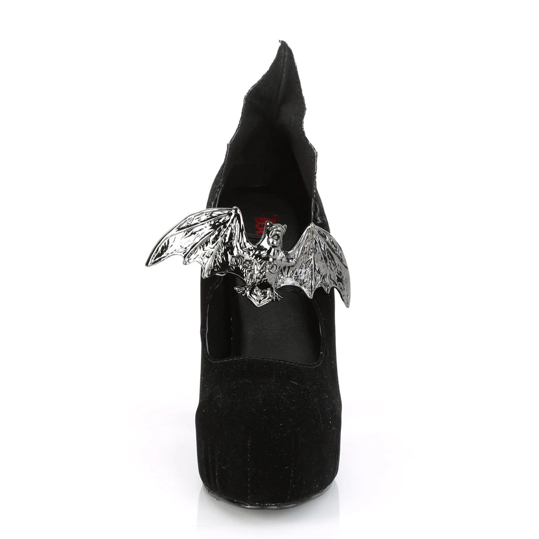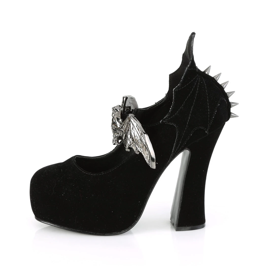 5″ (127mm) Heel, 1 1/2″ (38mm) Concealed Platform Slip-On Mary Jane Pump Featuring Elastic Strap w/ Large Metal Bat & Cone Spike Studded Bat Wing Detail on the Heel Cap