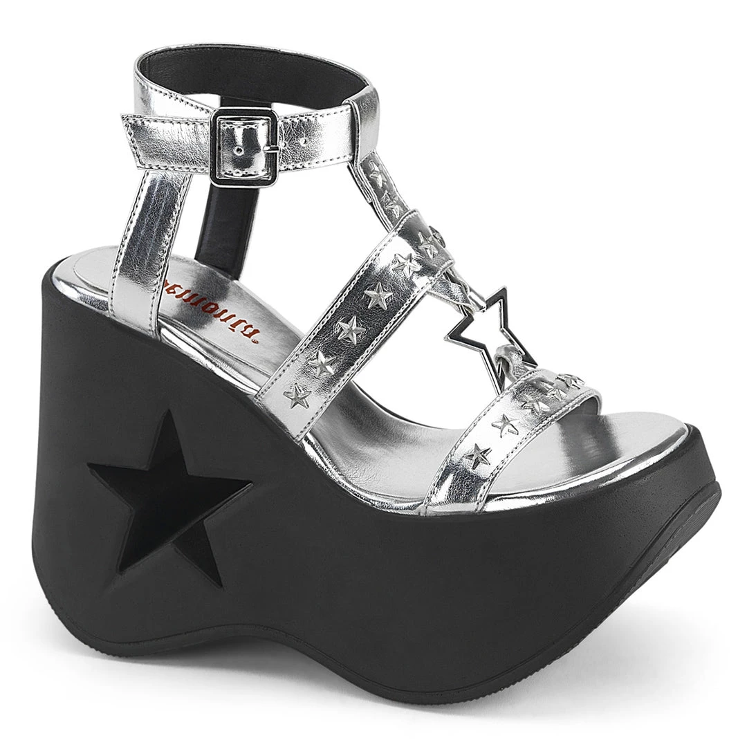 5″ (127mm) Star Cutout Platform Wedge Wrap Around Ankle Strap Strappy Sandal, Featuring Silver-Tone Star Studded Straps and Star Ring Detail