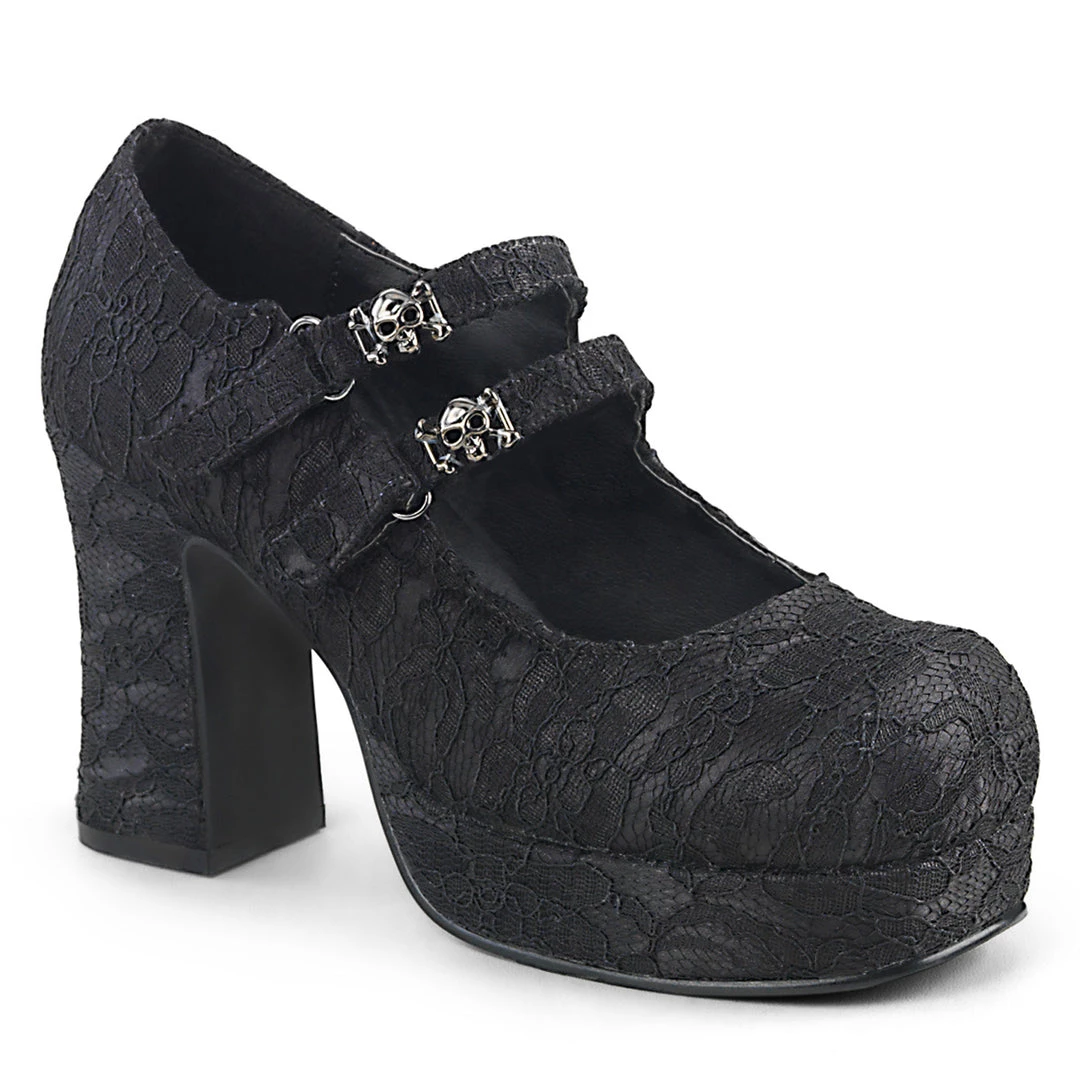3 3/4″ (95mm) Heel, 1 1/4″ (32mm) Platform Double Hook N’ Loop Strap Maryjane w/ Skull & Cross Bone Metal Ornaments