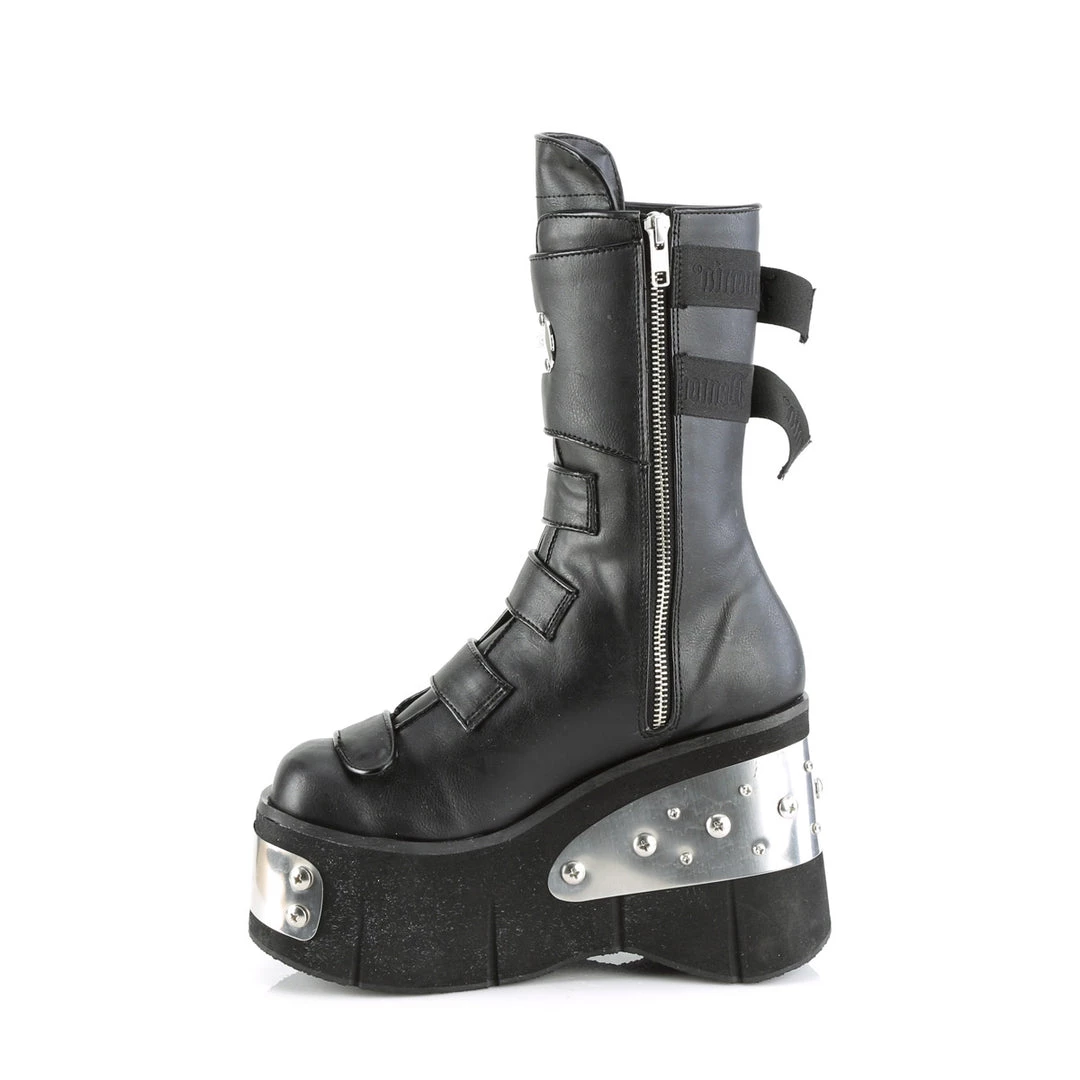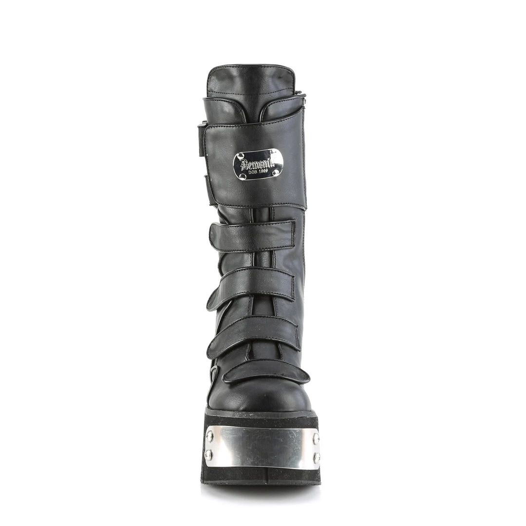 4 1/2″ (114mm) Front & Back Metal Plated Platform Strappy Mid-Calf Boot Featuring Front Sheild w/ Branded Metal Plate Center Detail & Dual Snap Buckles and Hook & Loop Straps on the Remaining Straps,