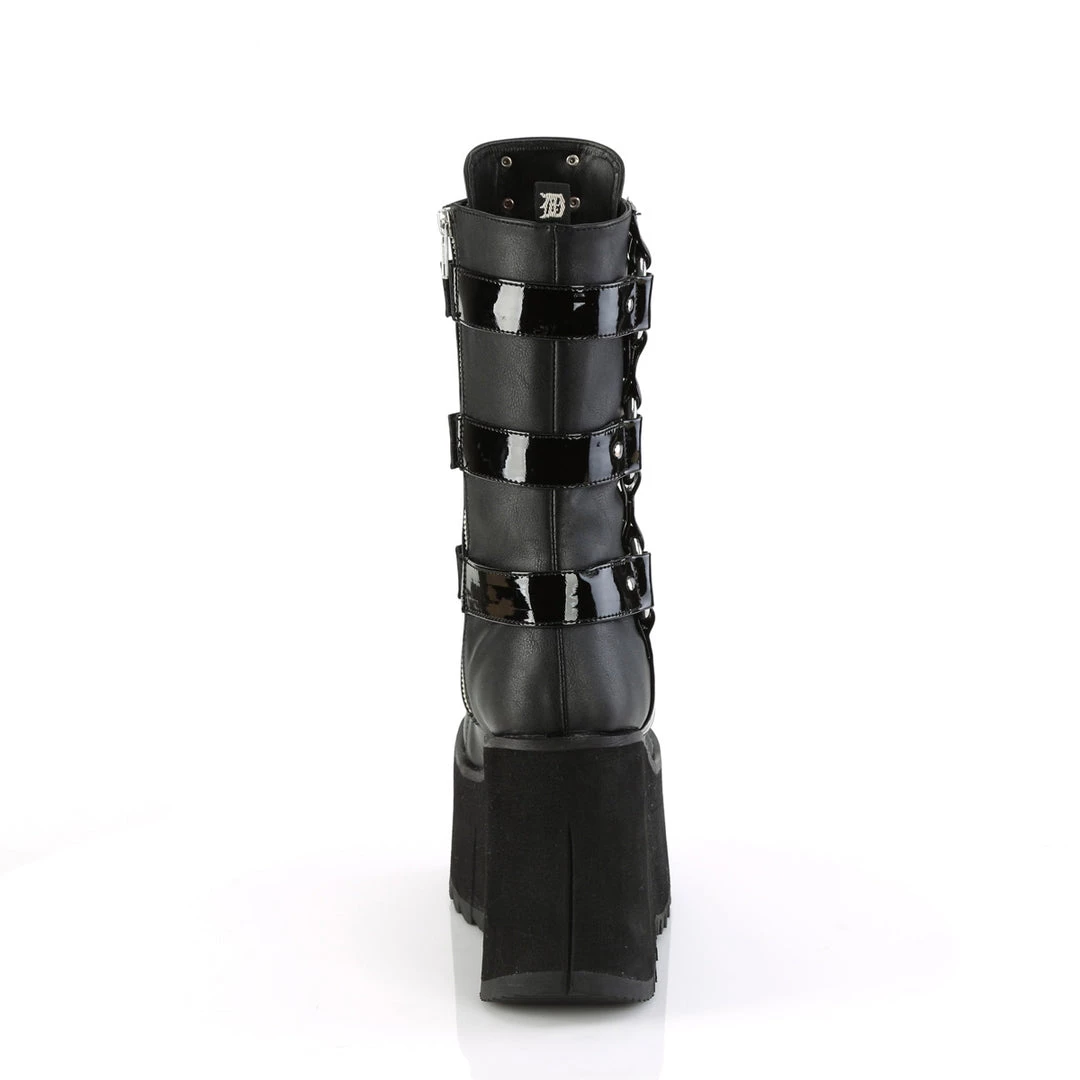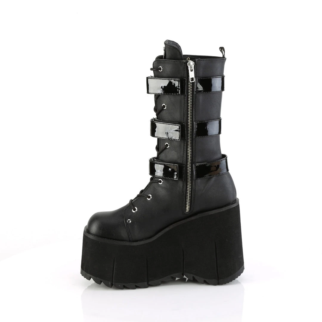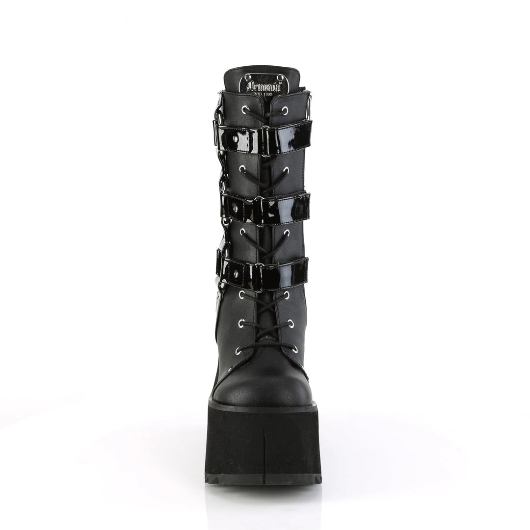 4 1/2″ (114mm) Platform Lace-Up Mid-Calf Boot Featuring Outer Side Studded Harness Detail w/ Adjusting Inside Hook N Straps & Branded Metal Plate on Tongue, Inside Metal Zip Closure