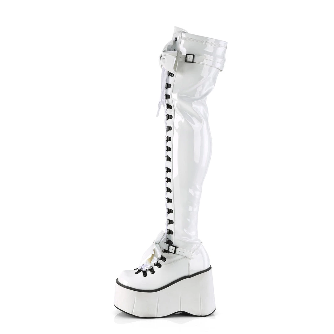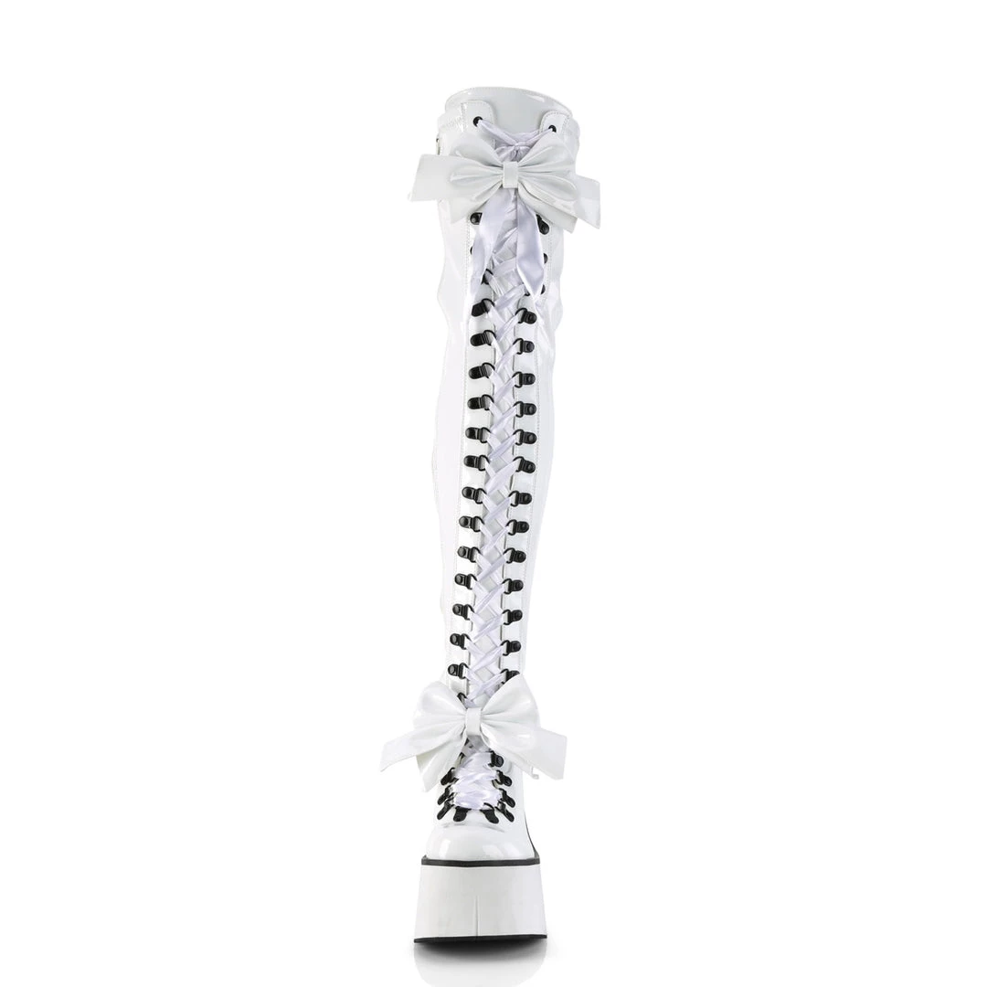 4 1/2″ (114mm) Wedge Platform D-Ring Lace-Up Thigh High Boots Featuring Adjustable Straps & Removeable Oversize Bow at Ankle & Thigh, Full Length Inner Side Zip Closure