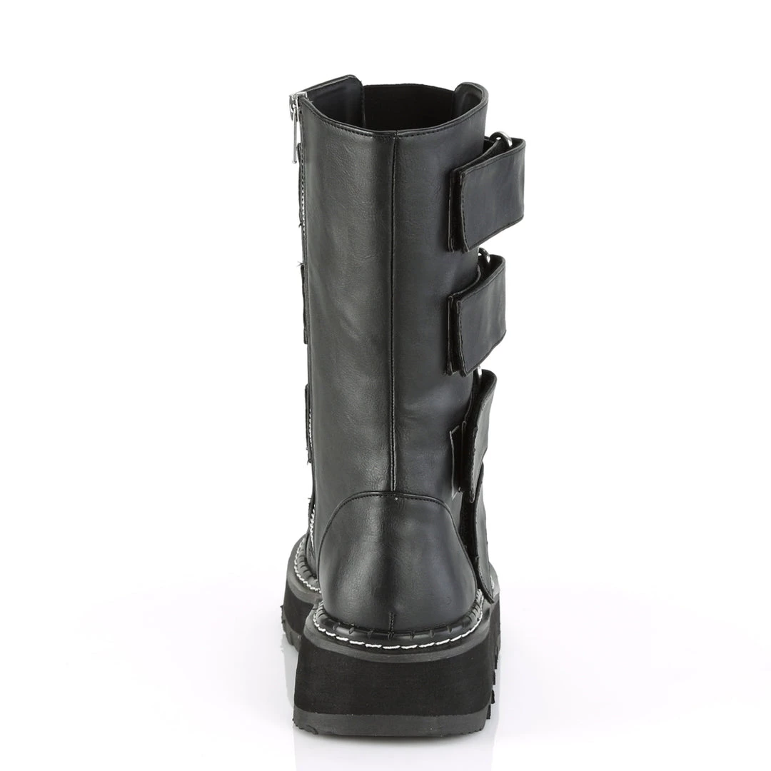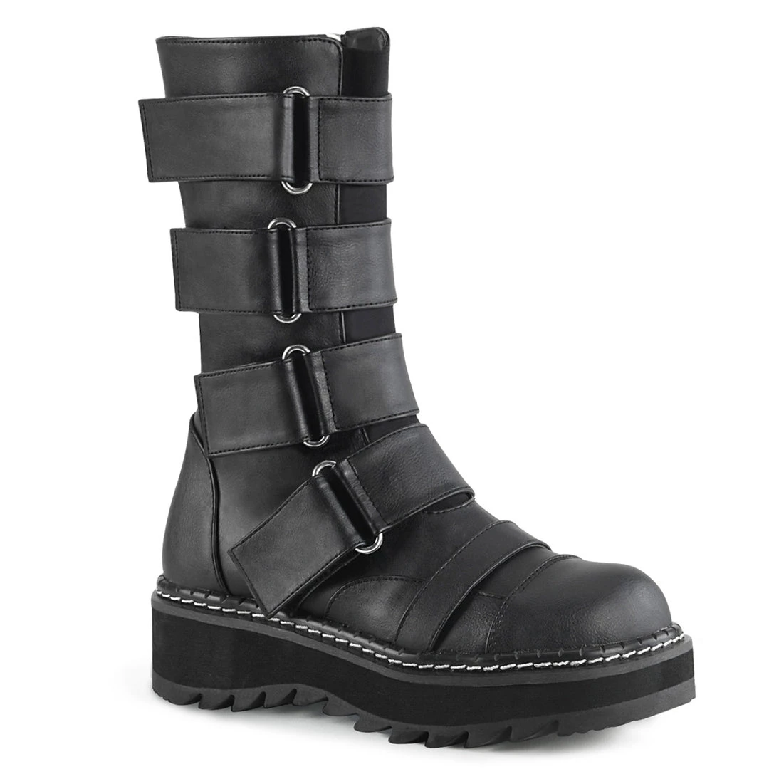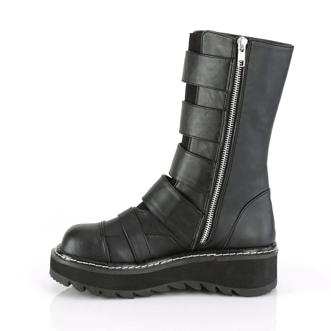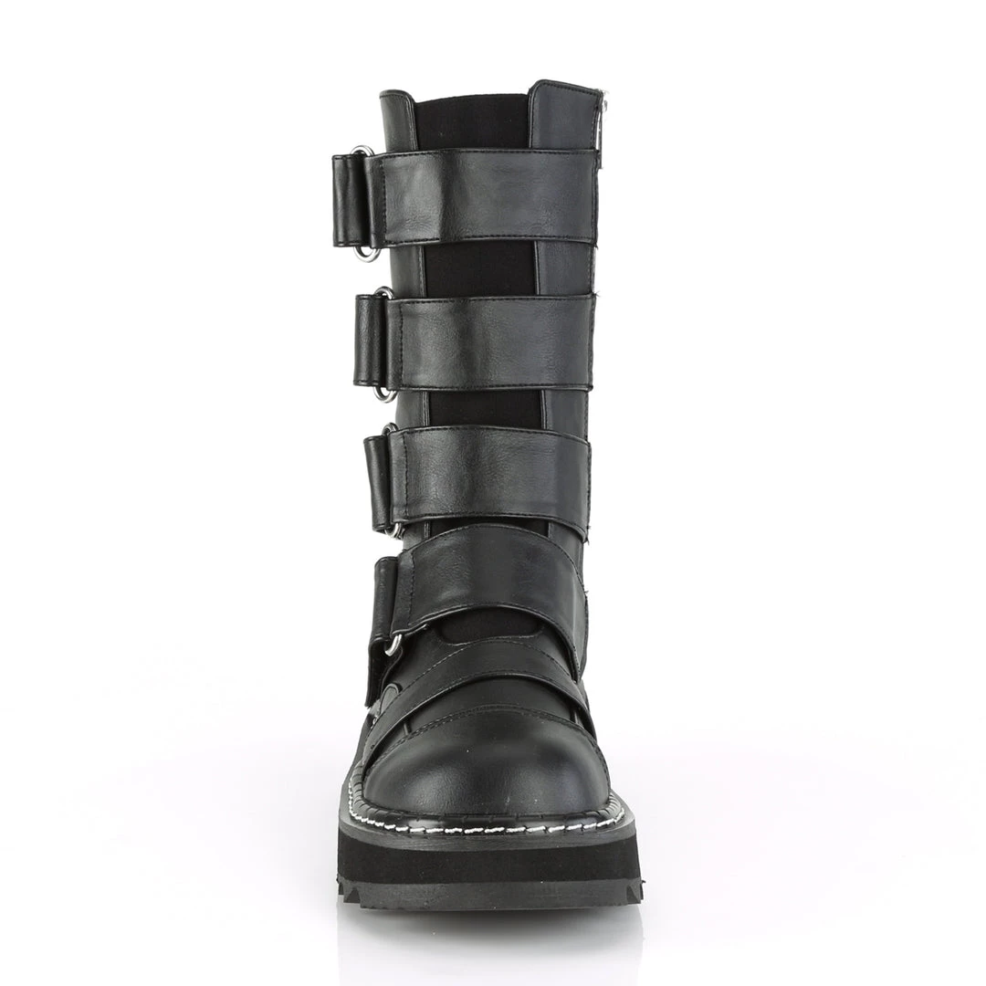 1 1/4″ (32mm) PlatformFront Strap Mid-Calf Boot Featuring Elastic Front Panel w/ 4 Hoop N’ Loop Straps, Side Zip Closure