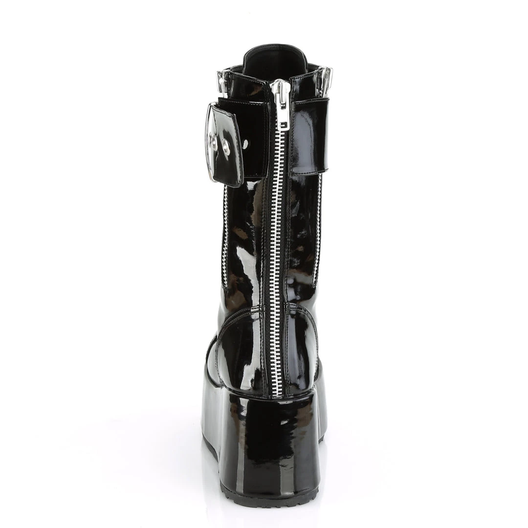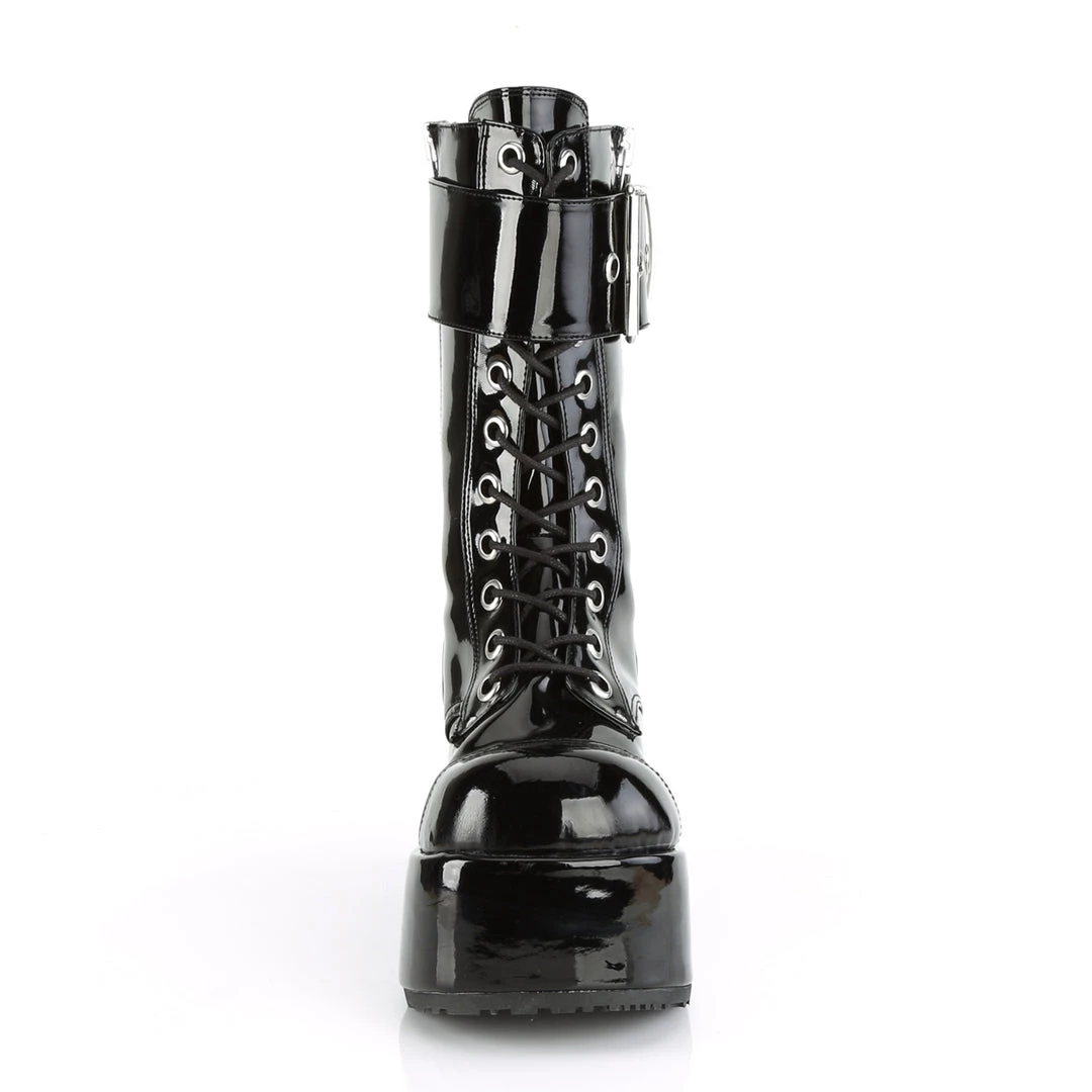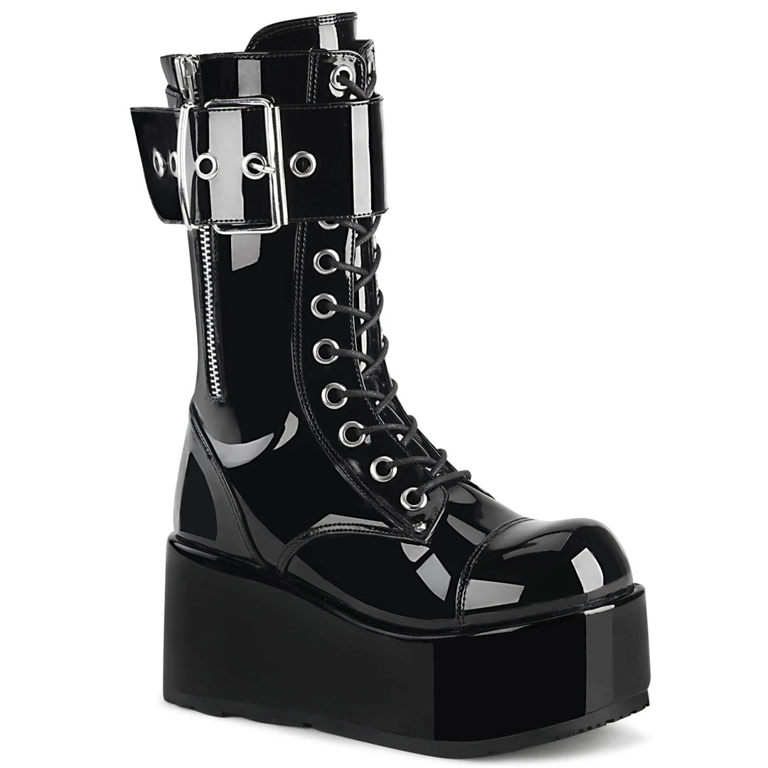 3 1/2″ (90mm) Platform Lace-Up Mid-Calf Boot Featuring Ornamental Inner & Outer Zipper Details and Oversize Buckle Strap, Back Zip Closure