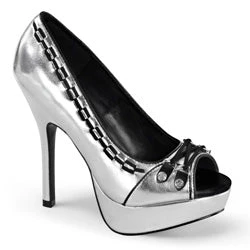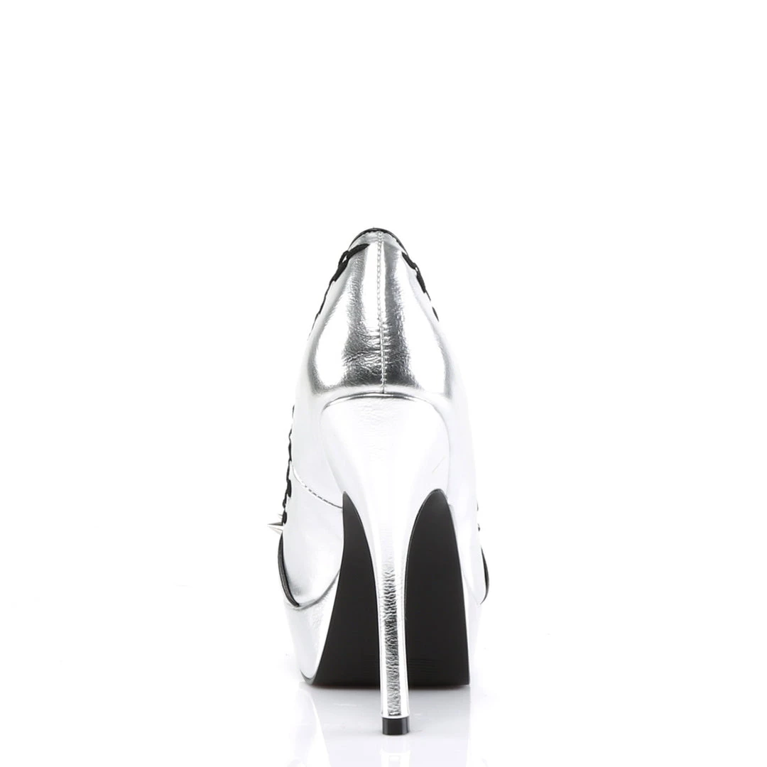 5 1/4″ (133mm) Heel, 1 1/4″ (3.2cm) Platform Peep Toe Pump Featuring Criss-Cross D-Ring Lace on Vamp, Pointed Studs, Interwoven Apron & Piping Detail