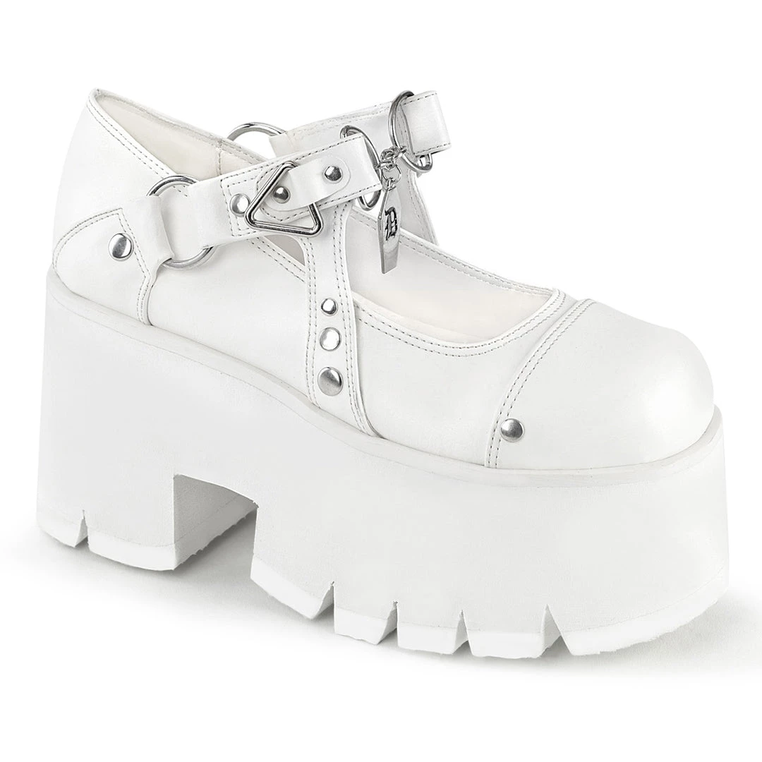 3 1/2″ (90mm) Chunky Heel, 2 1/4” (57mm) Cut Out Platform Hook & Loop Maryjane Featuring Silver Stud Embellishments on Upper, Triangle & O-Ring Details & Coffin Shaped Charm at Center Strap