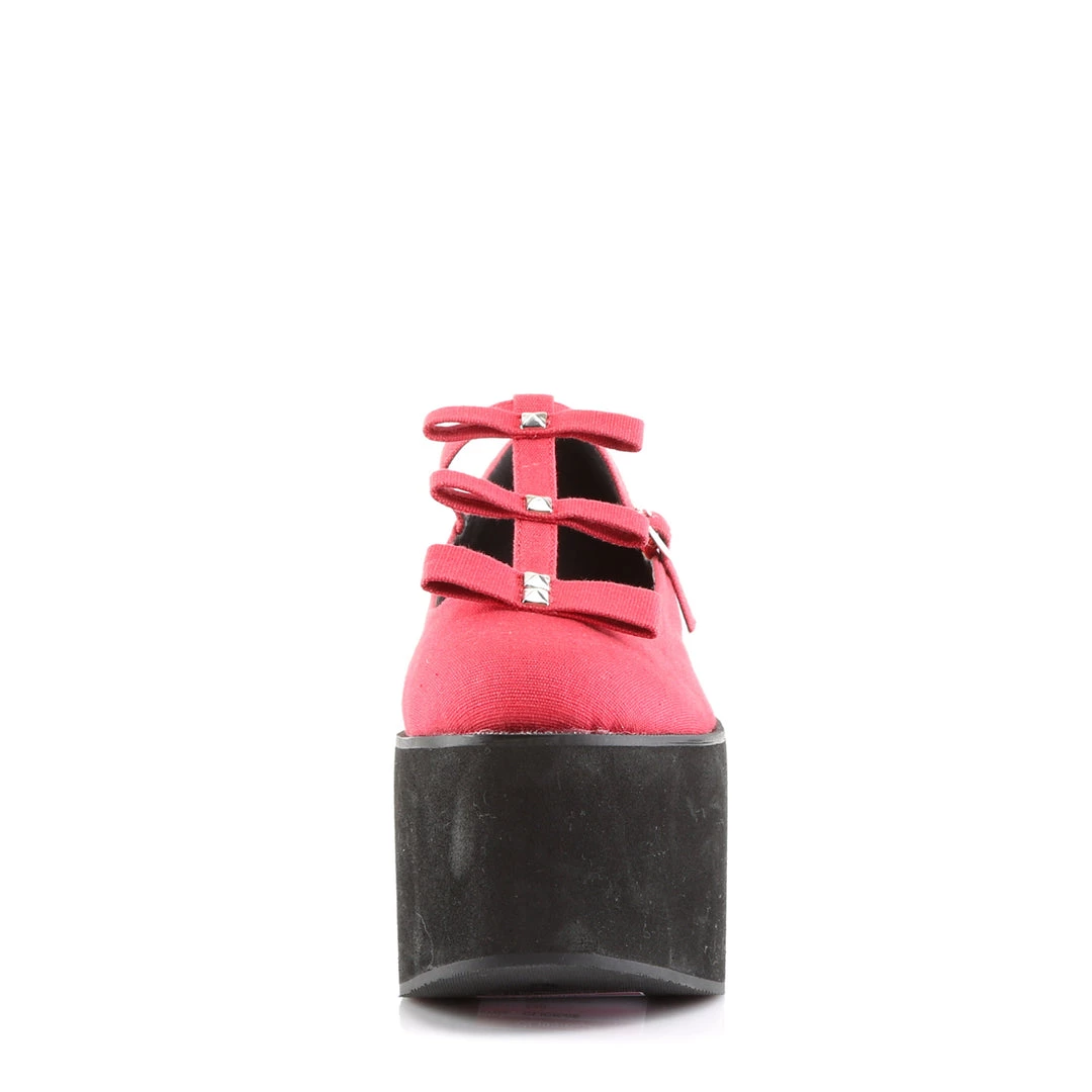 3 1/4″ (83mm) Platform T Strap with Triple Bows and Pyramid Studs Detail, Buckled Ankle Strap Closure