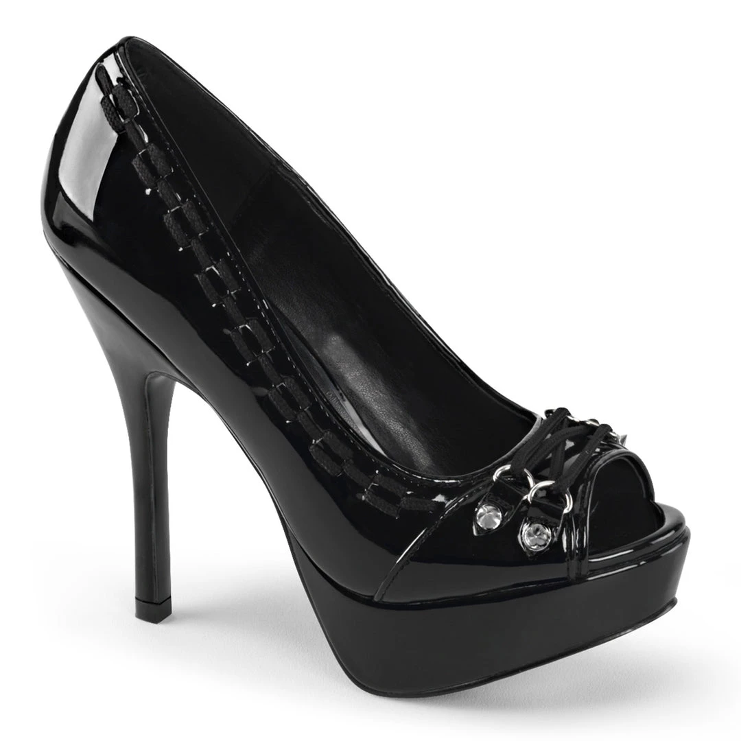 5 1/4″ (133mm) Heel, 1 1/4″ (3.2cm) Platform Peep Toe Pump Featuring Criss-Cross D-Ring Lace on Vamp, Pointed Studs, Interwoven Apron & Piping Detail