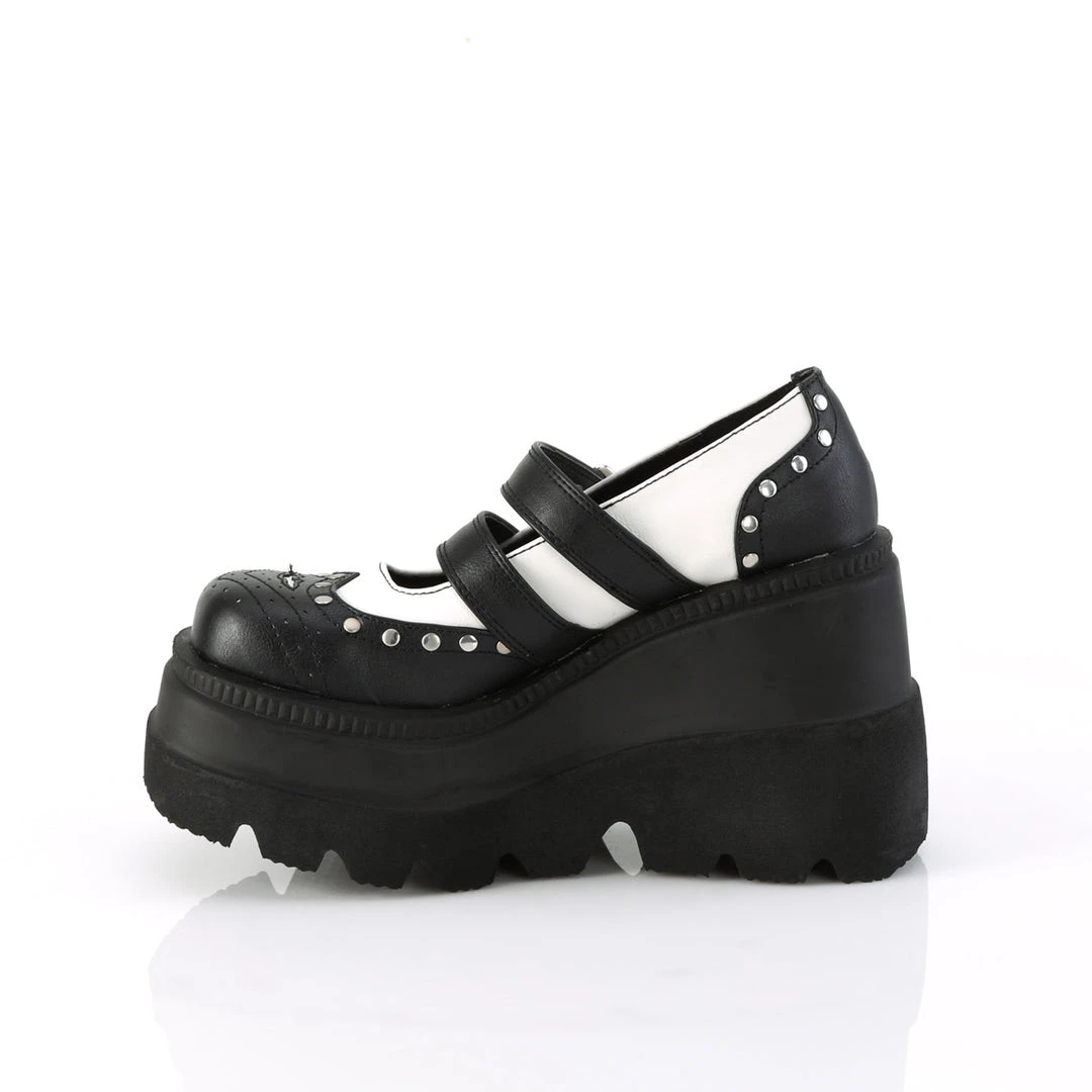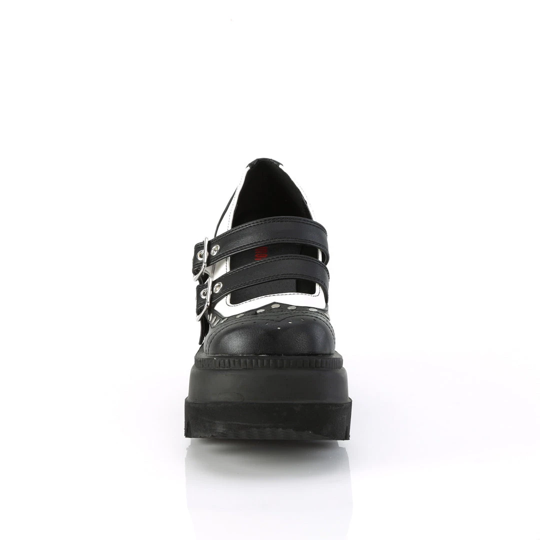 4 1/2″ (114mm) Wedge Platform Double Buckle Strap Wingtip Maryjane Featuring Silver-Tone Flat Round Studded Vamp and Heel