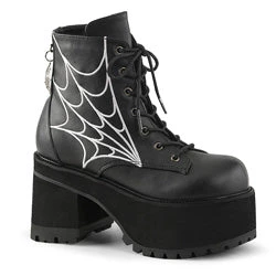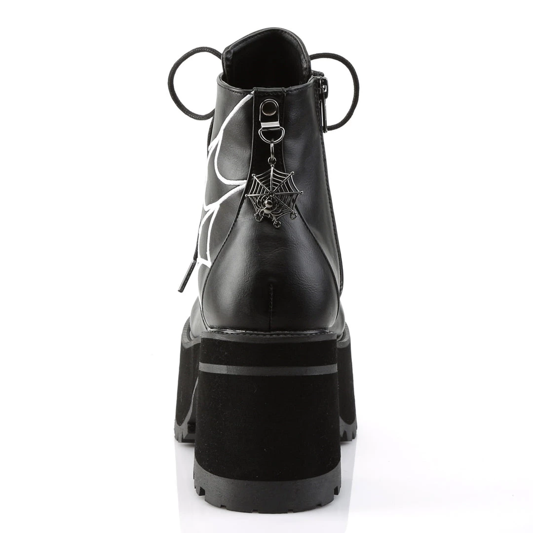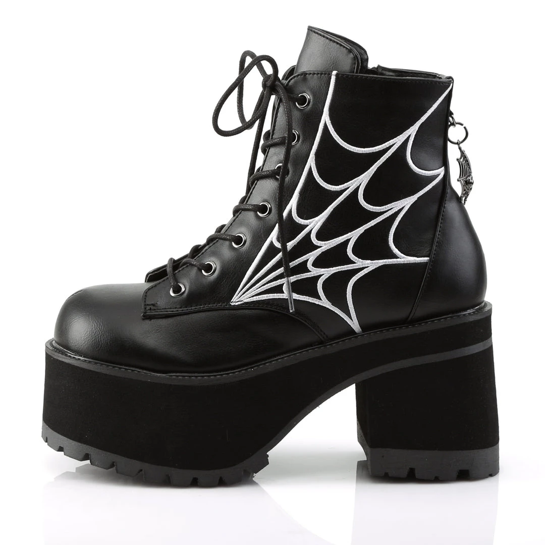 3 3/4″ (95mm) Heel, 2 1/4″ (57mm) Platform Lace-Up Front Ankle Boot with Spider Web Charm at the Back & Spider Web Embroidery Detail, Inner Side Zipper