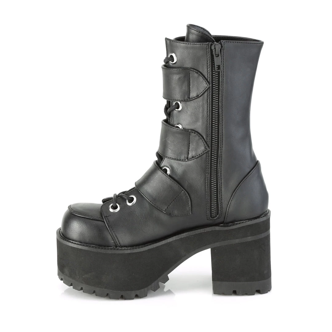 3 3/4″ (95mm) Block Heel 2 1/4″ (64mm) Platform Lace-Up Front Ankle Boot Featuring Triple Buckle Straps, Inside Metal Zip Closure