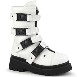 2 1/2″ Tiered Platform Strappy Calf High Boot Featuring Quick Release Plastic Buckle Straps, Center Front Metal Zip Closure