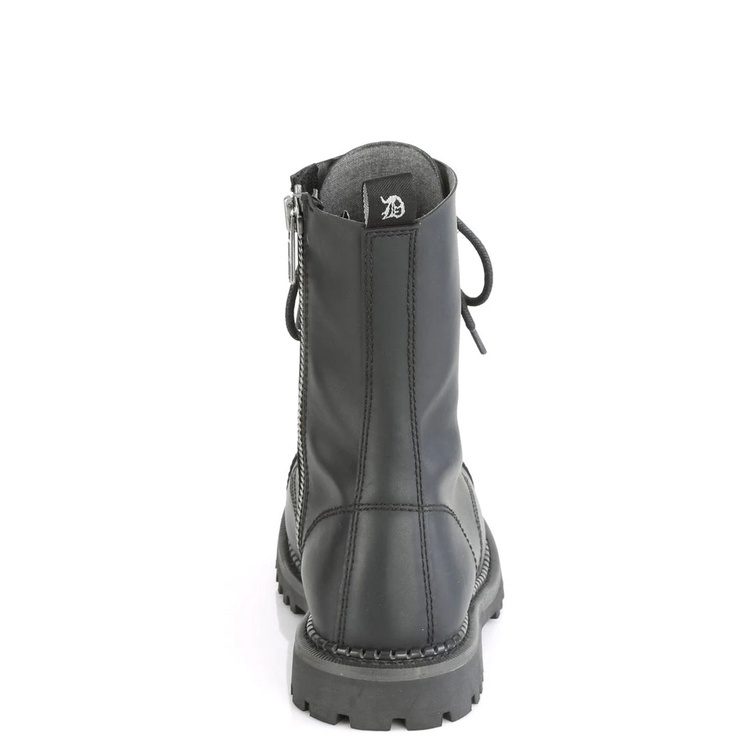 Demonia 10 Eyelet Unisex Vegan Steel Toe Lace-Up Ankle Boot, Rubber Sole, Full Length Inside Zip Closure