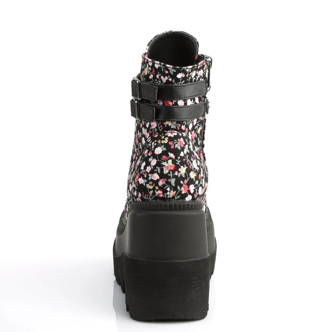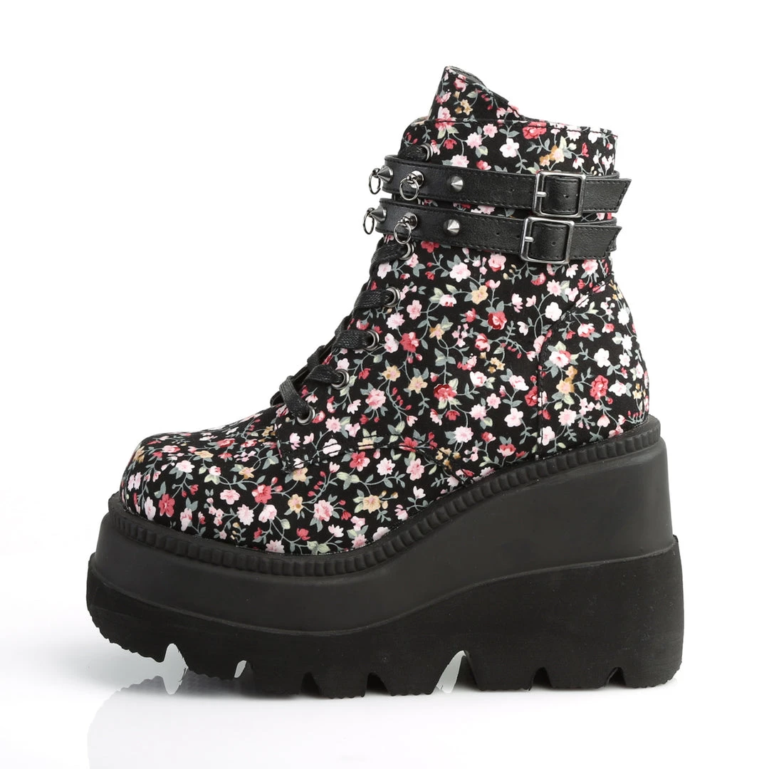 4 1/2″ (114mm) Wedge Platform Lace-Up Front Ankle Boot w/ Double Buckled Ankle Straps Featuring Spike and O-Ring Details, Inside Zip Closure